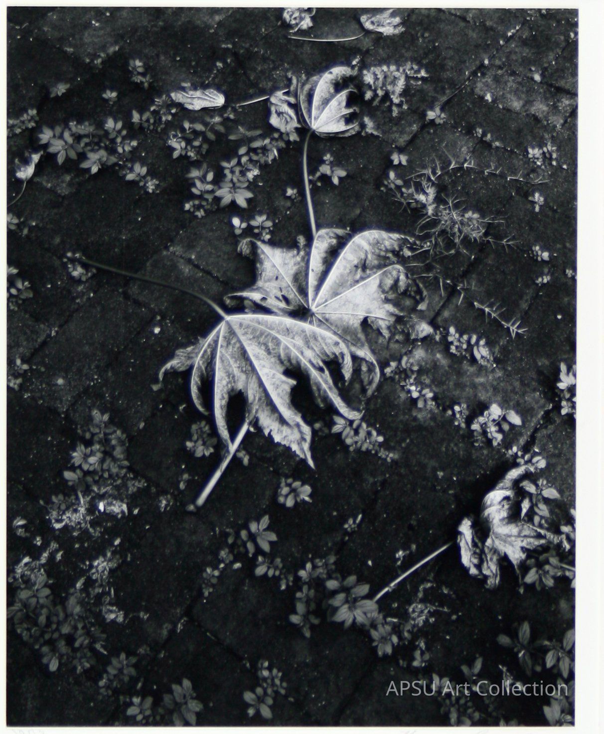 Black and white gelatin silver print of the back of two light in value leaves laying on weather worn bricks that have small mid value plants sprouting in the space between bricks, Ajijic, Mexico, 1973Collection