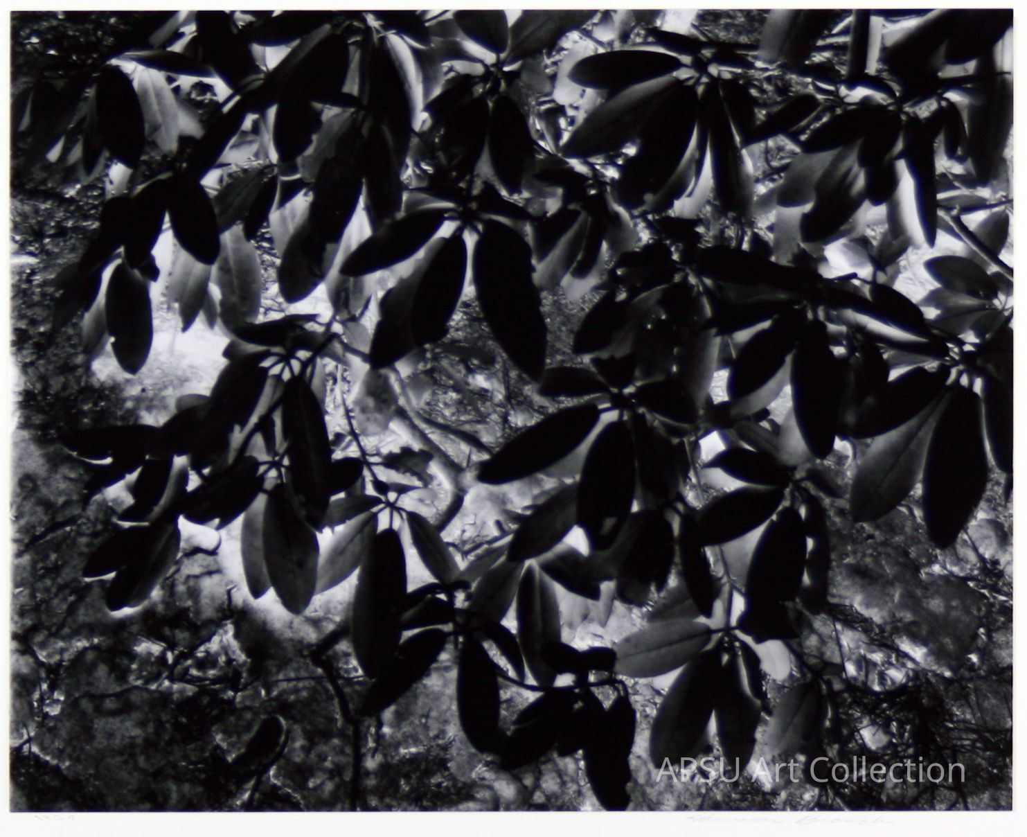 Black and white gelatin silver print of leaves filling the entire picture plane, the dark leaves are contrasted by light filtering behind them, New Haven, CT, 1972Collection