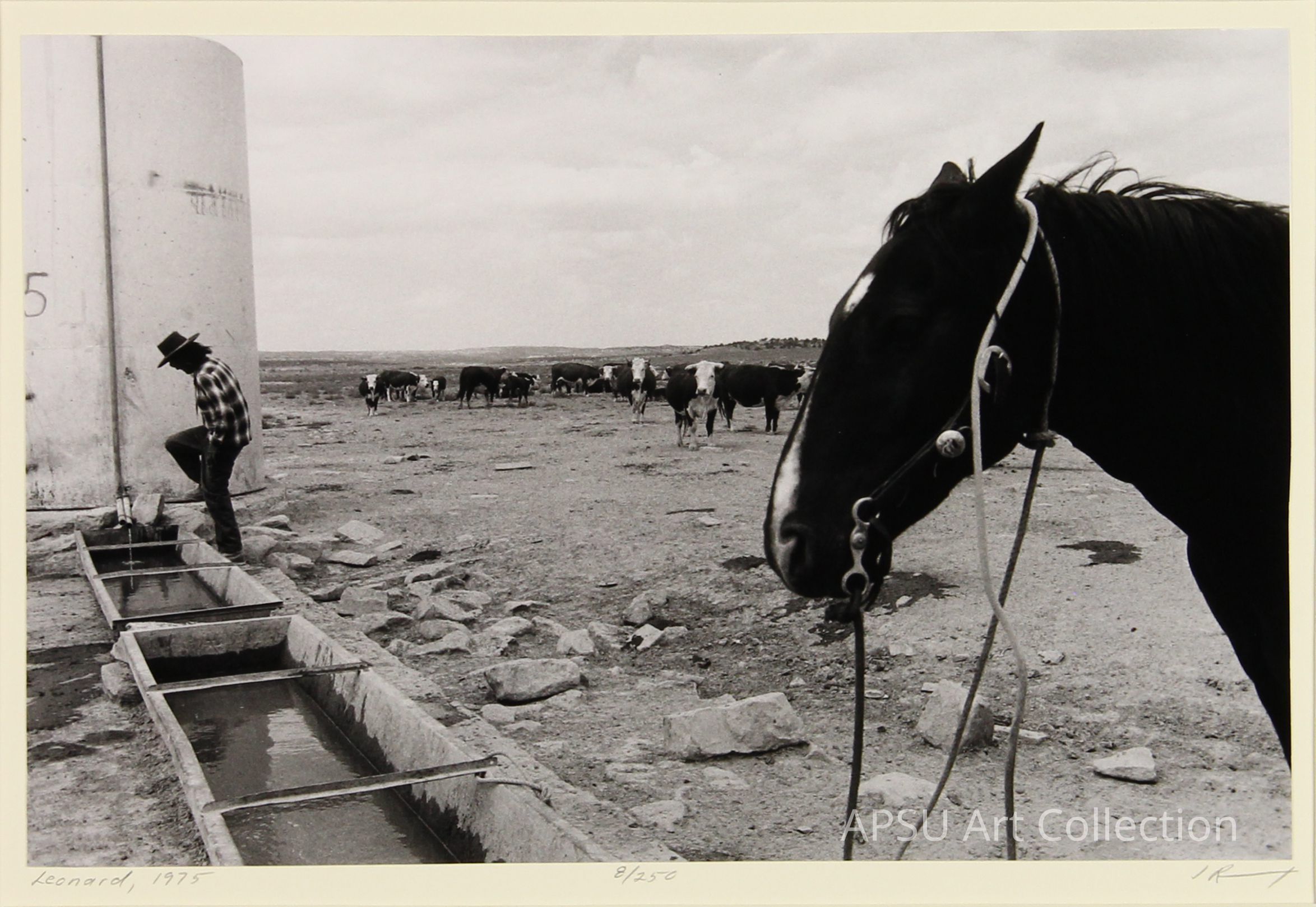 A horse standing in the foreground with a rancher standing behind him looking down into a irrigation stream with cows in the distance.Collection