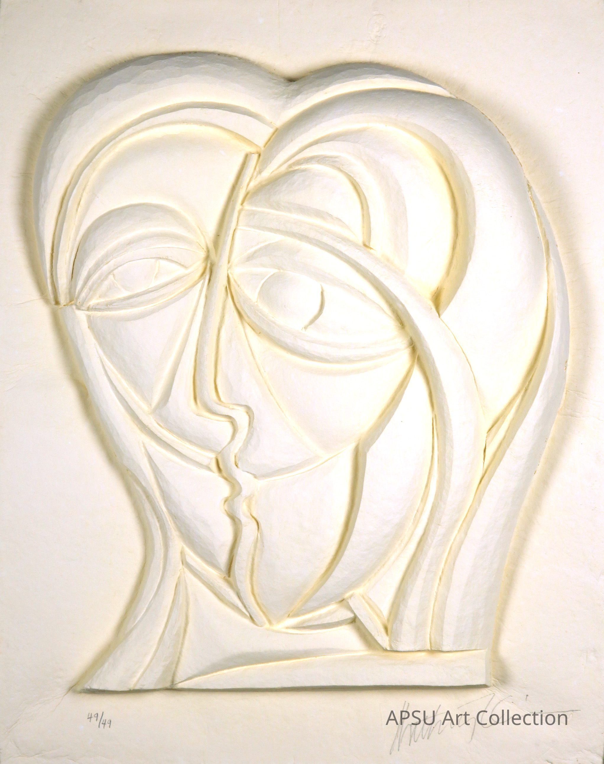 This image depicts a textured, relief sculpture showcasing an abstract, stylized representation of two kissing faces. The artwork features exaggerated, fluid lines that form the contours and features of the face, primarily focusing on the eyes and nose region. The piece appears monochromatic, utilizing shades of white and cream to enhance the three-dimensional effect. A signature is visible at the bottom right corner, indicating the artist’s acknowledgment, while the left corner contains a fraction, possibly representing a limited edition number. The overall presentation