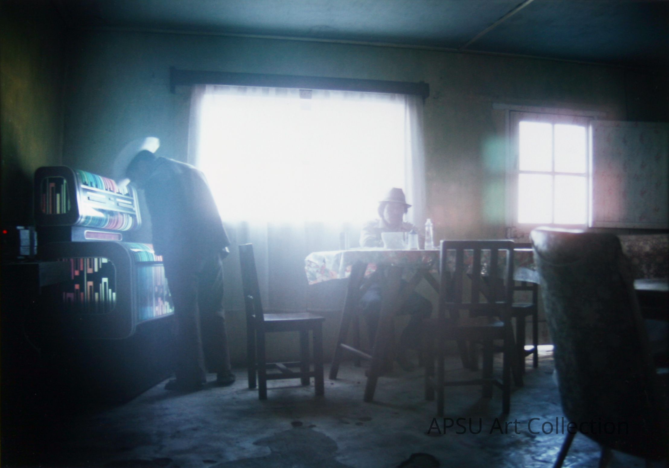 This image captures a dimly lit interior scene featuring two individuals; one man is selecting a song from a jukebox near the frame's left edge while another, wearing a hat, sits at a table bathed in diffuse light near large windows covered with thin curtains. The ambiance is somber and quiet, suggesting a moment paused in time in a rustic setting adorned with simple furniture including wooden chairs, suggesting a local café or similar establishment.
