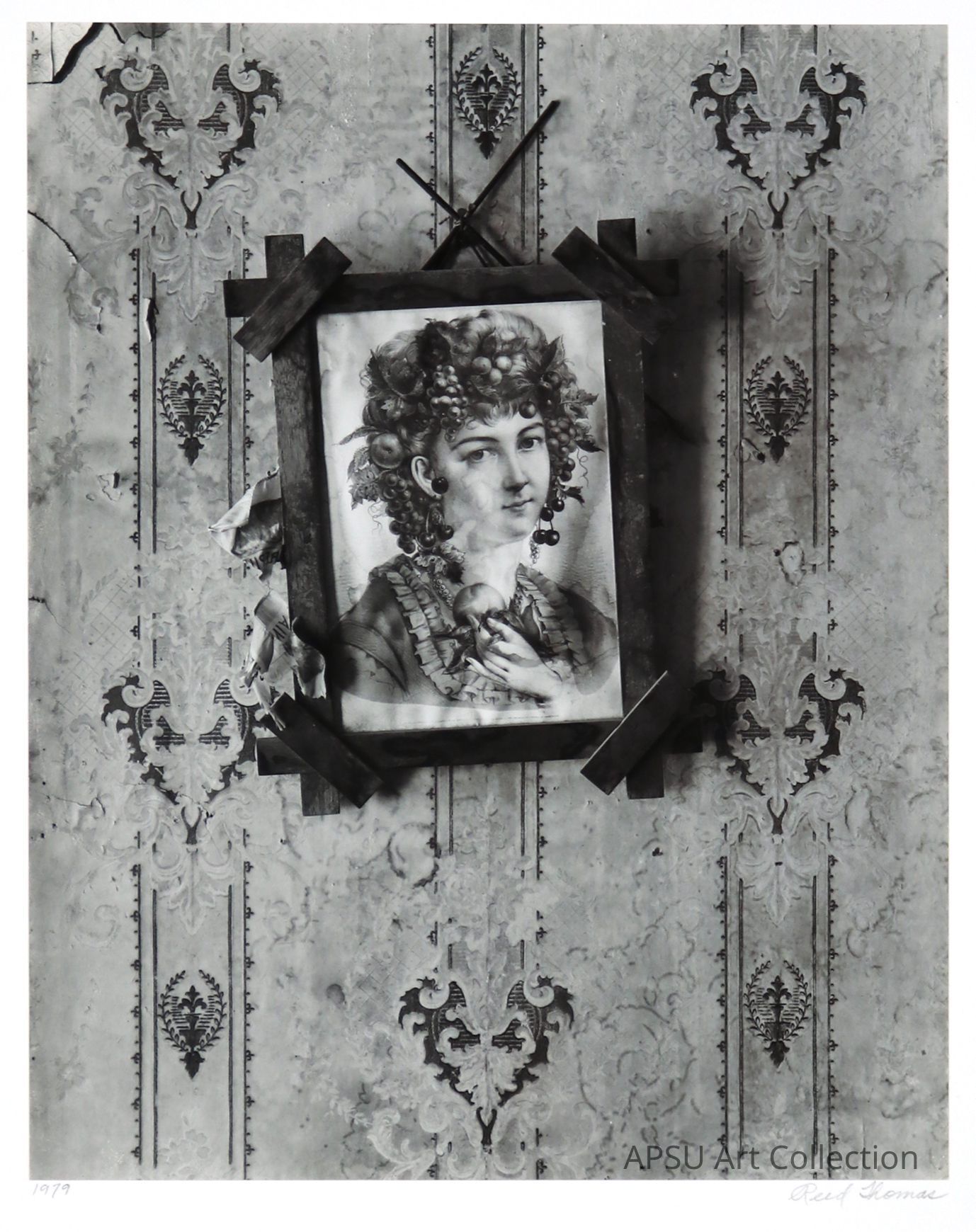 The image shows a black-and-white photograph of a circular frame containing a portrait of a woman with elaborate hair adorned with grapes and leaves, set against a textured backdrop of floral wallpaper. The frame is crossed by black tapes, creating a dramatic contrast with the elegant décor. The wall is decorated with intricate and symmetric patterns that add depth to the composition.