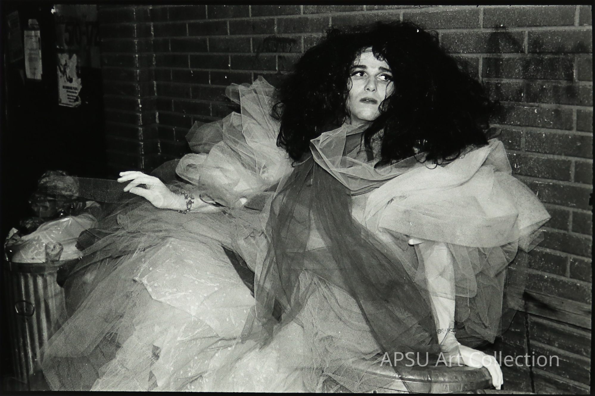 Gelatin silver Print photograph of a man wearing a dress and wig, all while sitting on garbage cans. The dress has a lot of tulle. The background is a brick wall, with some graffiti on the right side.Collection