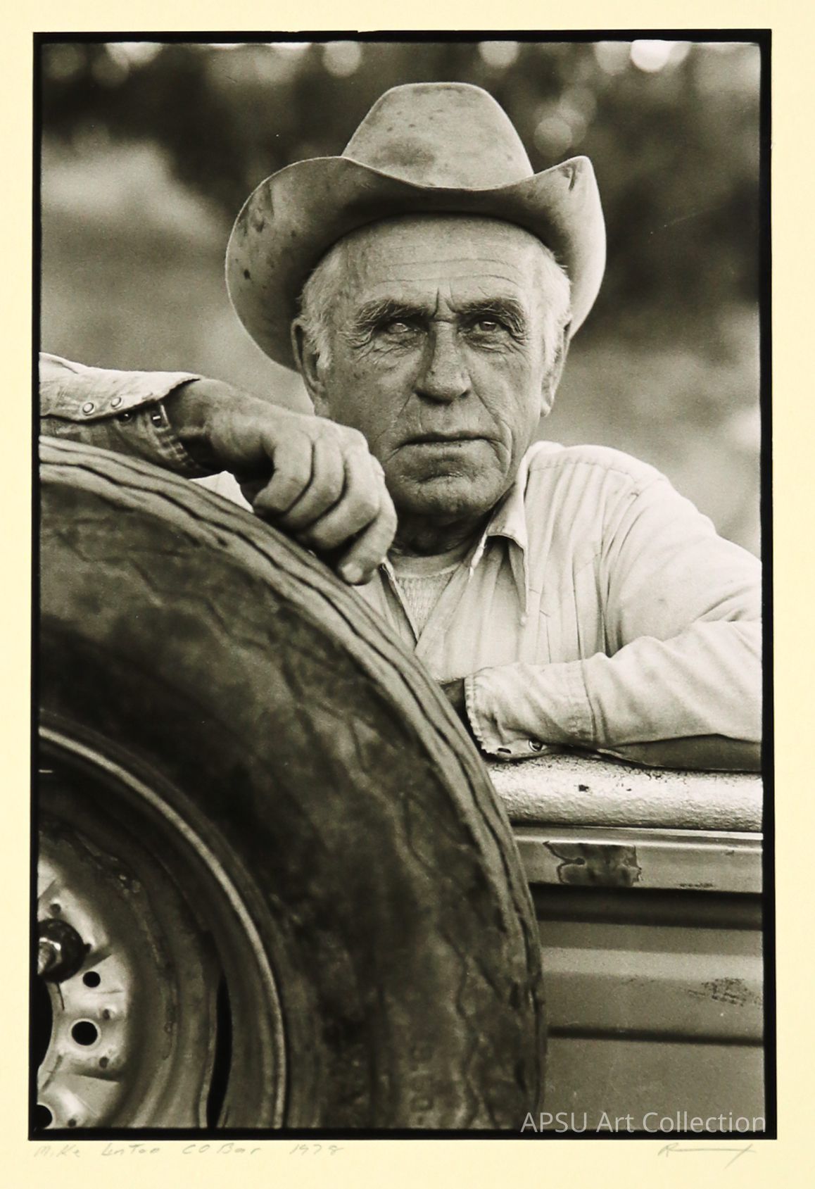 Photograph of older man posed against a tire. He appears to be partially blind and is wearing a cowboy hat.