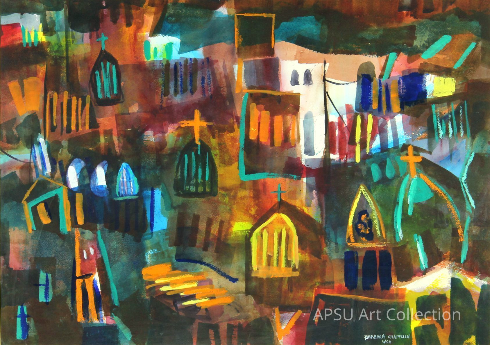Geometric forms of buildings painted in watercolor. Barbara Champlin "Mission Tours, San Antonio"Type of Painting