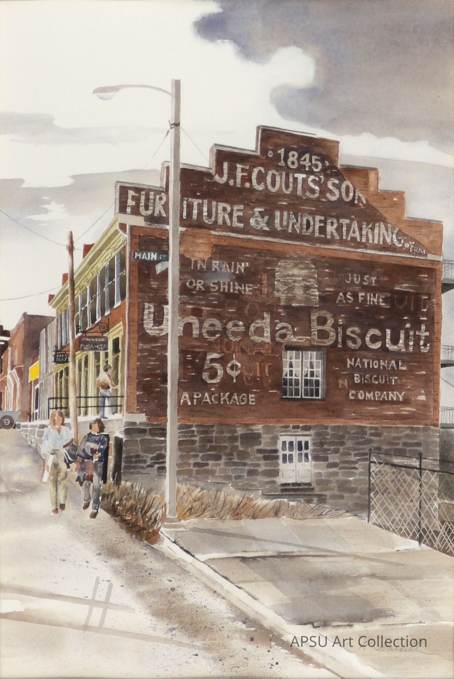 A building sitting in the street with a couple of people walking on the sidewalk next to it.Type of Painting