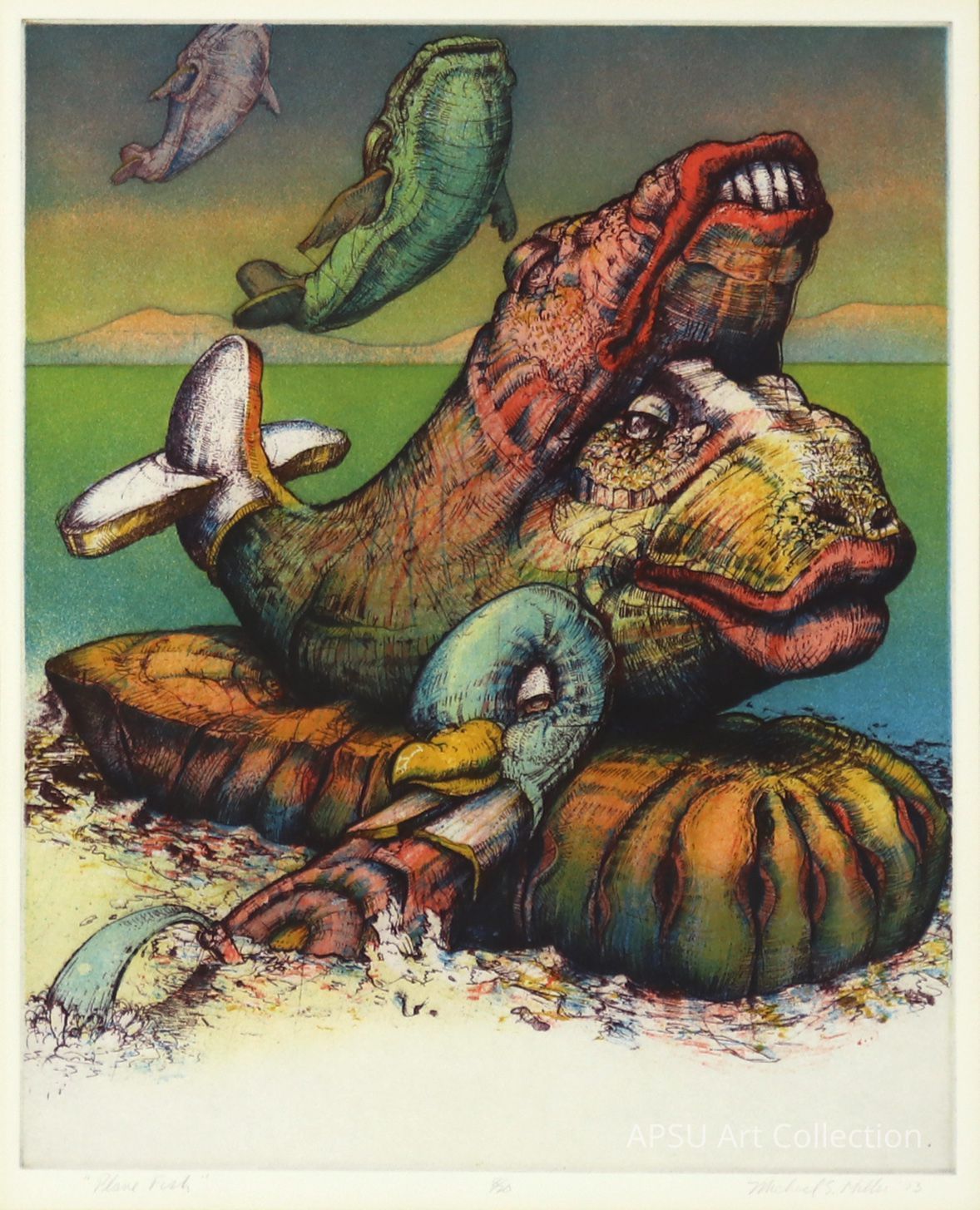 Multi-Color aquatint image of fantastical creatures that resemble whales.
