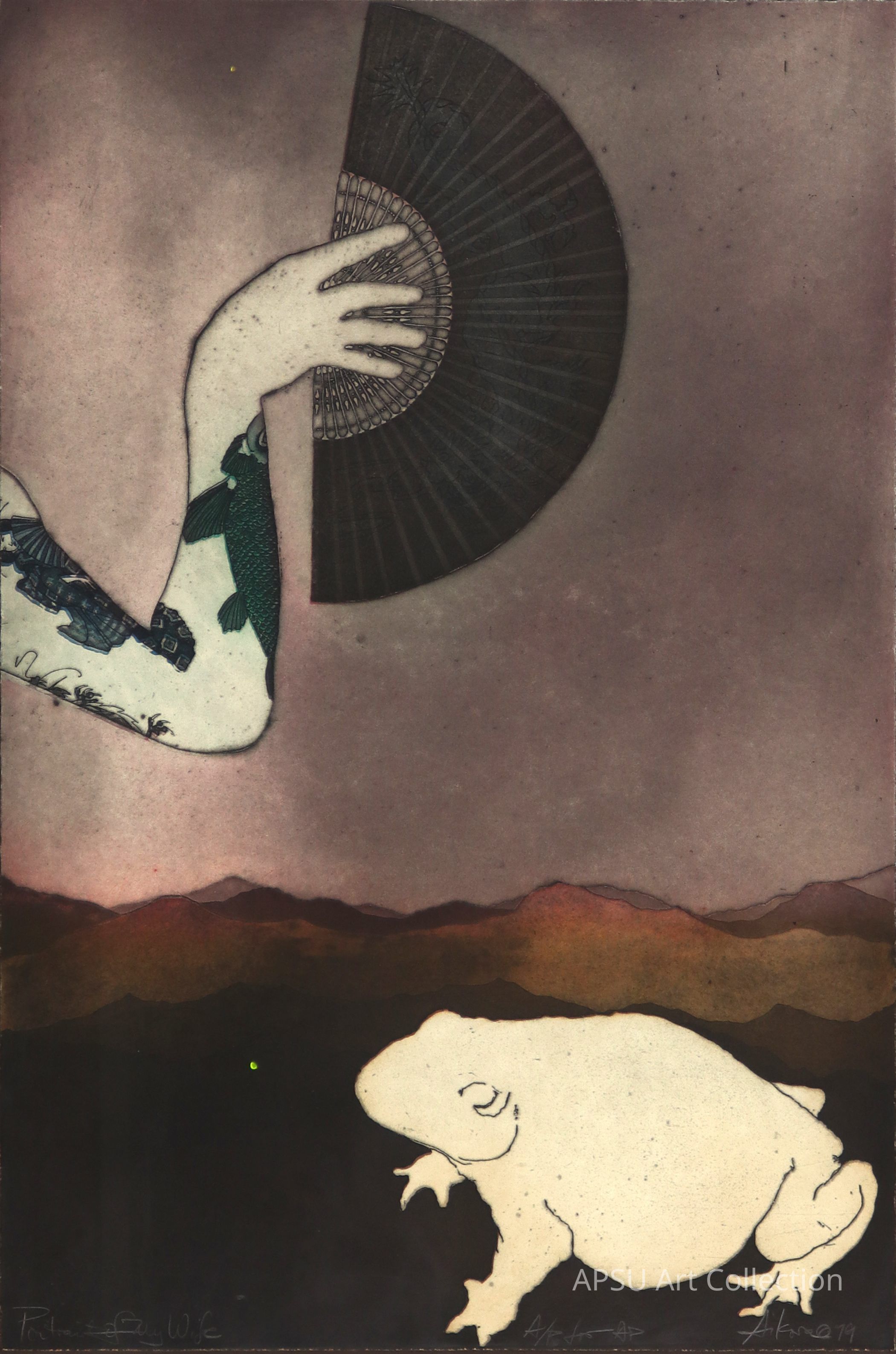 Artist Proof. Multicolored serigraph image of a woman's arm with tattoos of a geisha and koi fish. Her hand is holding a fan. Below is a landscape scene with distant mountains and the large outline of a frog.Type of Print