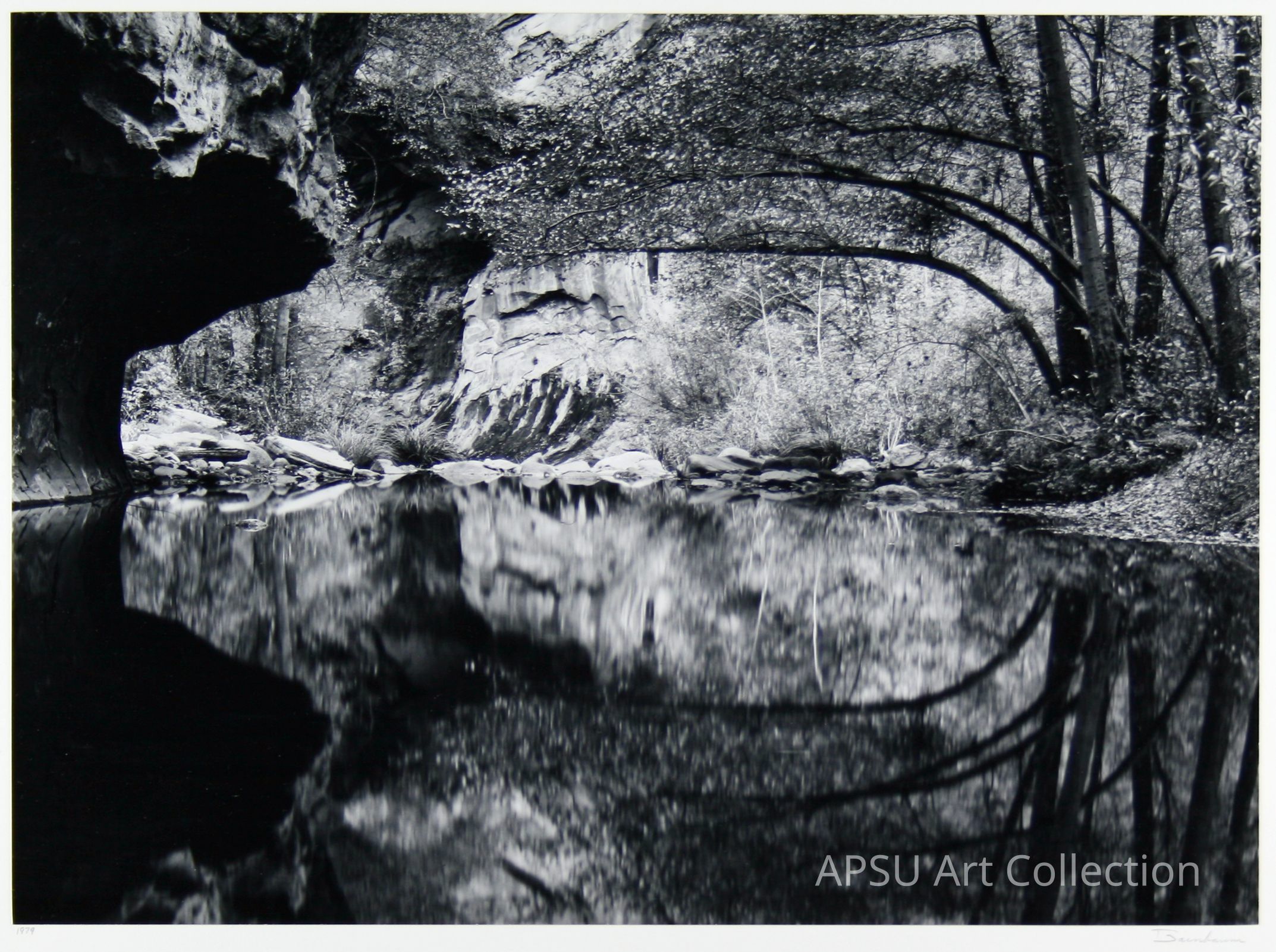 The black-and-white photograph captures a tranquil scene of a forested riverside with trees arching gracefully over a calm body of water, which mirrors the natural surroundings; the composition includes a rocky overhang on the left, while the foliage reflects in the water, fostering a sense of serenity and balance amidst the wilderness.