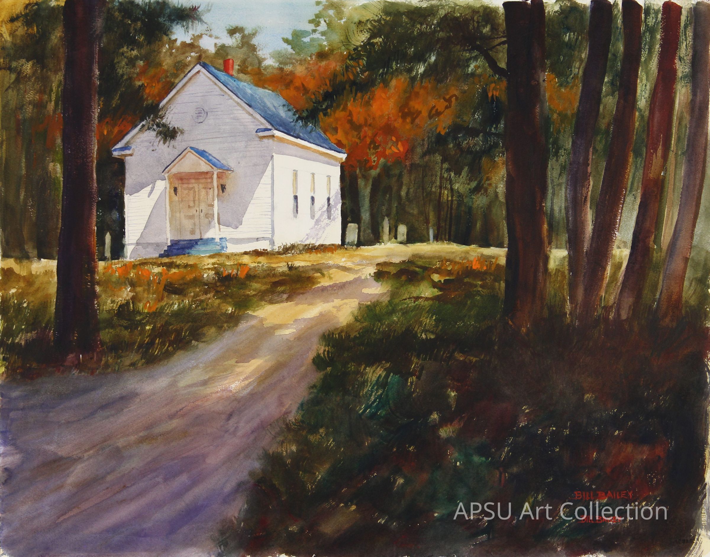 This image depicts a serene autumn landscape featuring a quaint, white house nestled among vibrant trees with shades of orange, red, and green. A dirt path winds towards the house, flanked by tall, dark trees on the right and patches of sunlit grass, hinting at the peaceful solitude of a rustic setting. The painting uses dynamic brushstrokes to evoke a sense of calm and natural beauty, inviting the viewer to imagine a quiet life amidst the forest's embrace.