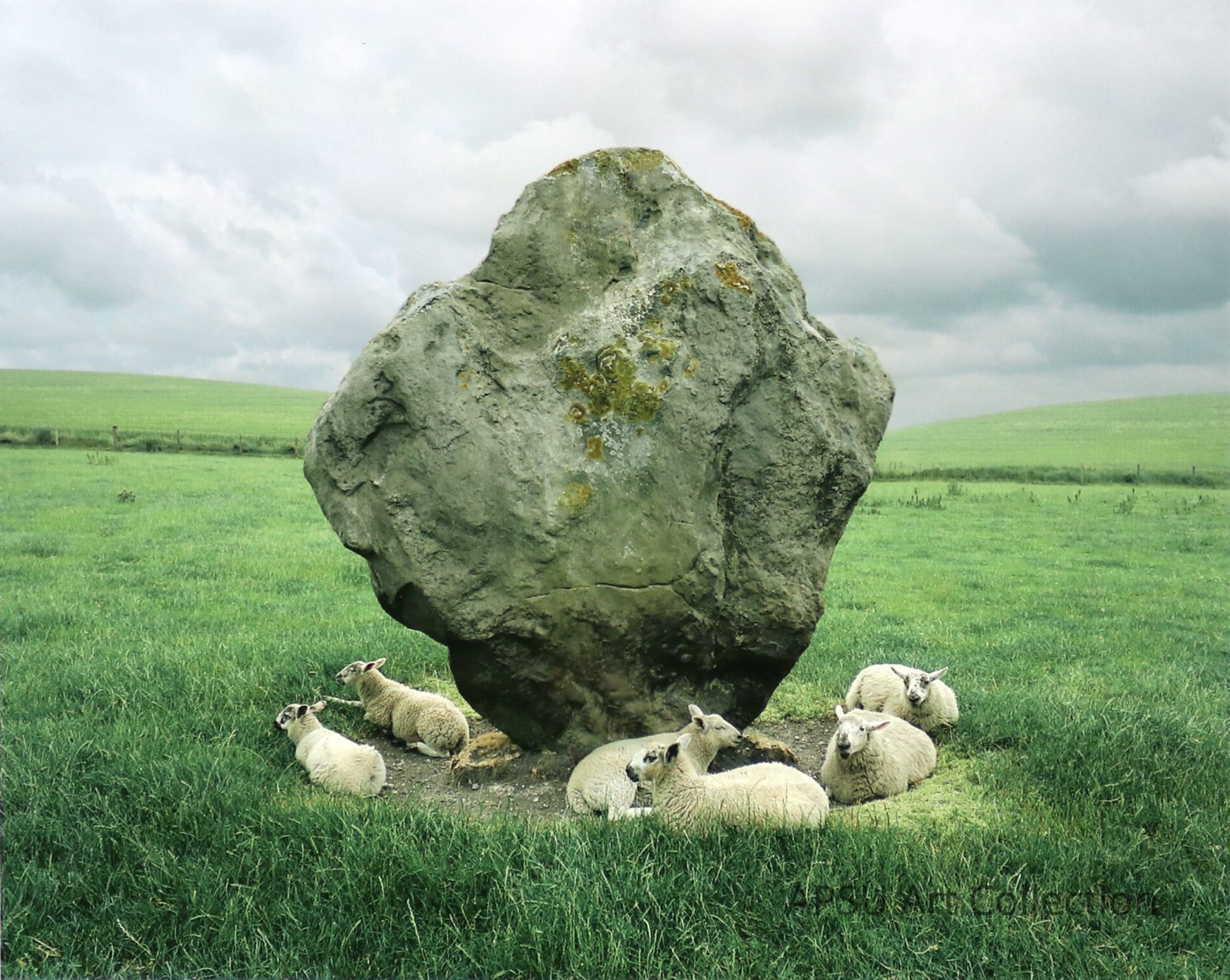The image shows a group of lambs resting in the shade of a large, moss-covered boulder in a lush green pasture under a cloudy sky. The vast, open landscape extends to the horizon, conveying serenity and the simplicity of pastoral life. The setting seems calm with the lambs comfortably huddled together, suggesting a quiet, peaceful day in a rural environment.