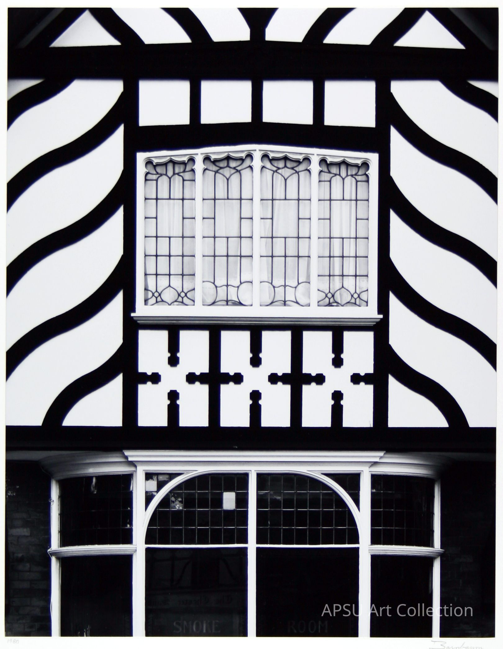 Black and white gelatin silver print of an ornate leaded window above a smoke shop of an old building with high contrast detail of black and white architecture, Chester, England, 1980Collection