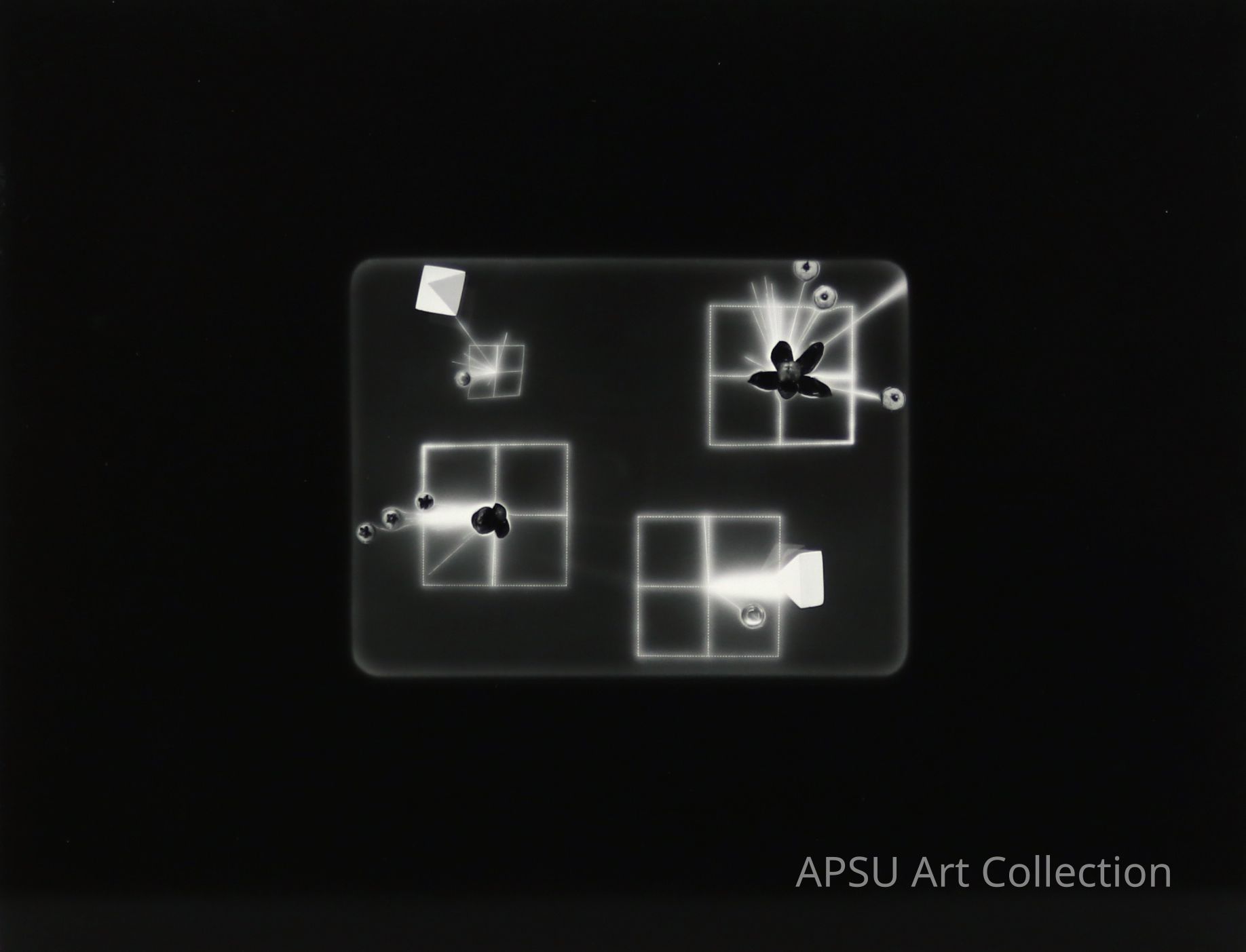 A grouping of four squares with various shapes and forms emerging from each of them. Each larger square is divided into four smaller squares.Collection