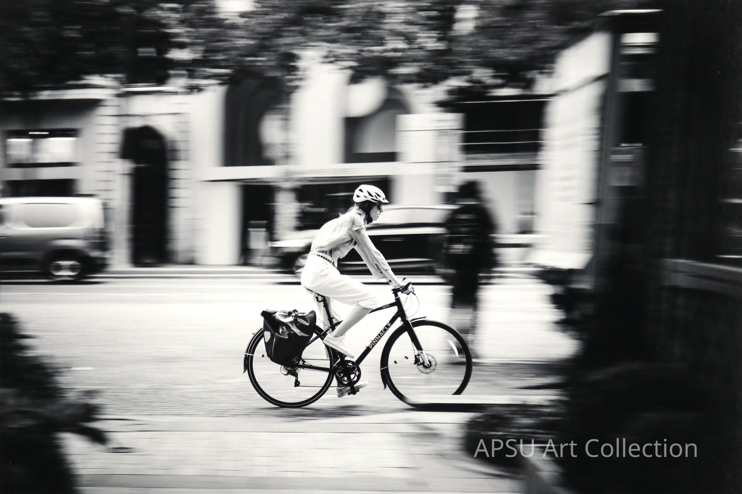 'Speeding Down the Champs-Elysees' is a photograph, set in a portrait style that shows a motion blurred photo taken from an alleyway looking out at a bike rider who seems to be the only thing in focus. The rider is wearing a pink blouse and white pants, a helmet sits atop her head. A man can he seen crossing the road infront of her, and cars can be seen in motion behind her. Store front can he made out in the background of the image.Collection
