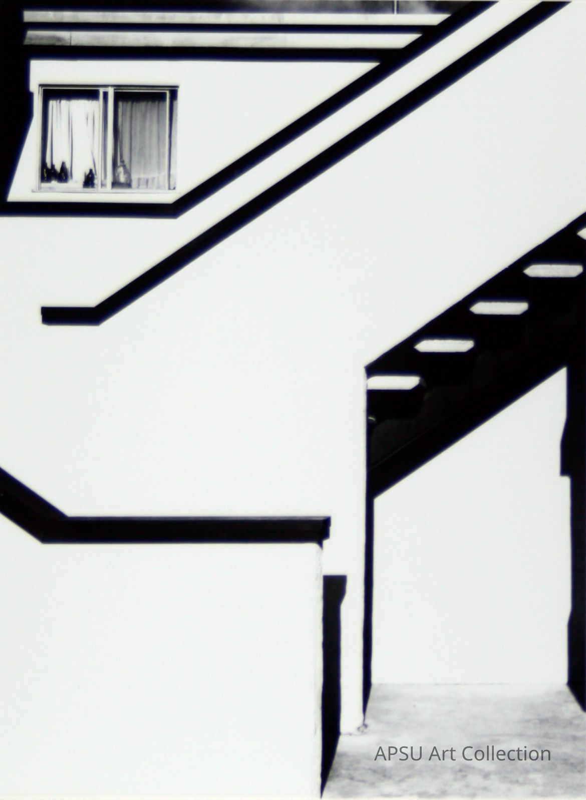 Black and white gelatin silver print of a staircase and window, bold black lines contrasted with large areas of white. Evidence of three-dimensionality in the tonal range of rectangular window.Collection