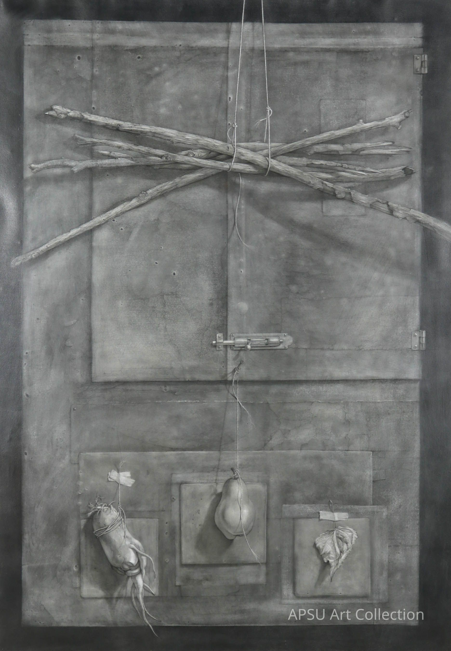 The image displays a monochromatic art piece, featuring a detailed depiction of a textured background resembling a wooden door. Various objects are suspended in front, including a bundle of sticks tied with twine at the top, symbolizing rustic simplicity. Below the sticks, two items hang individually: on the left is a radish with roots extending, and in the center, a pear is elegantly suspended by a string, casting gentle shadows on the backdrop. To the right is a single curled leaf secured by tape.