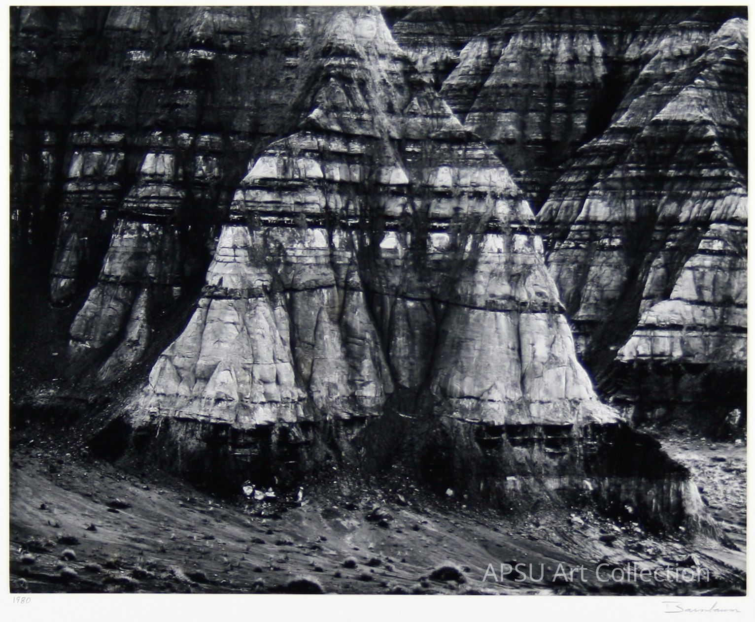 The image depicts a series of layered rock formations in a stark black and white photograph, where the erosion and stratification of the rocks are clearly visible, creating a visually striking contrast between the dark and light layers; the detailed texture suggests a geological formation shaped over countless millennia, encapsulating the rugged beauty of nature’s slow, relentless artistry. The bottom of the photo shows a scattered, rocky foreground, gradually blending into the monumental cliff faces that dominate the image.