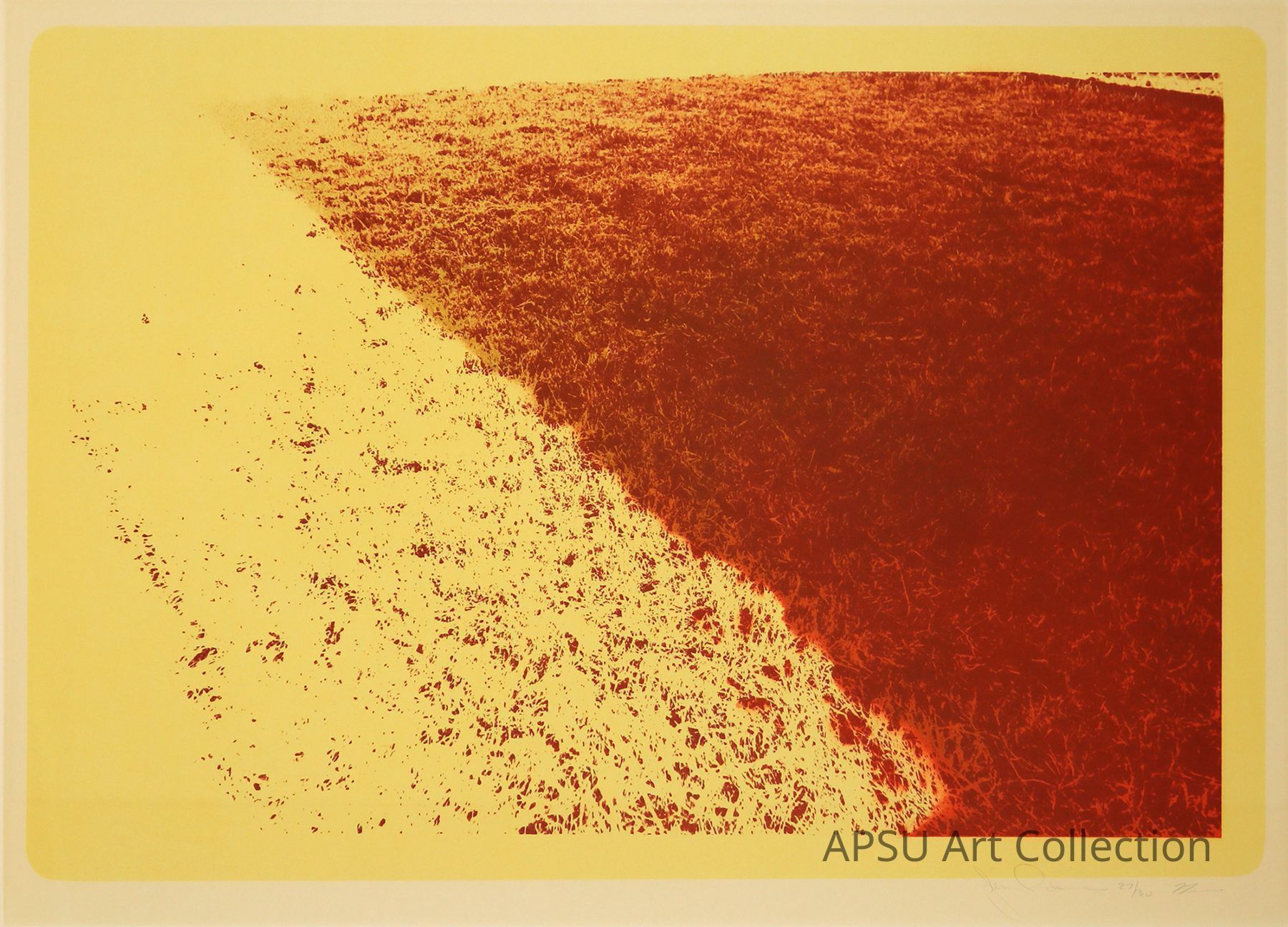 This image features an abstract yellow and red print depicting a gradient transition from sparse speckles on the left to a densely textured red zone on the right, framed within a yellow border, creating a visually striking contrast. The artwork, signed at the bottom right corner, uses a limited color palette to evoke a sense of depth and movement, highlighting the interplay between light and texture.