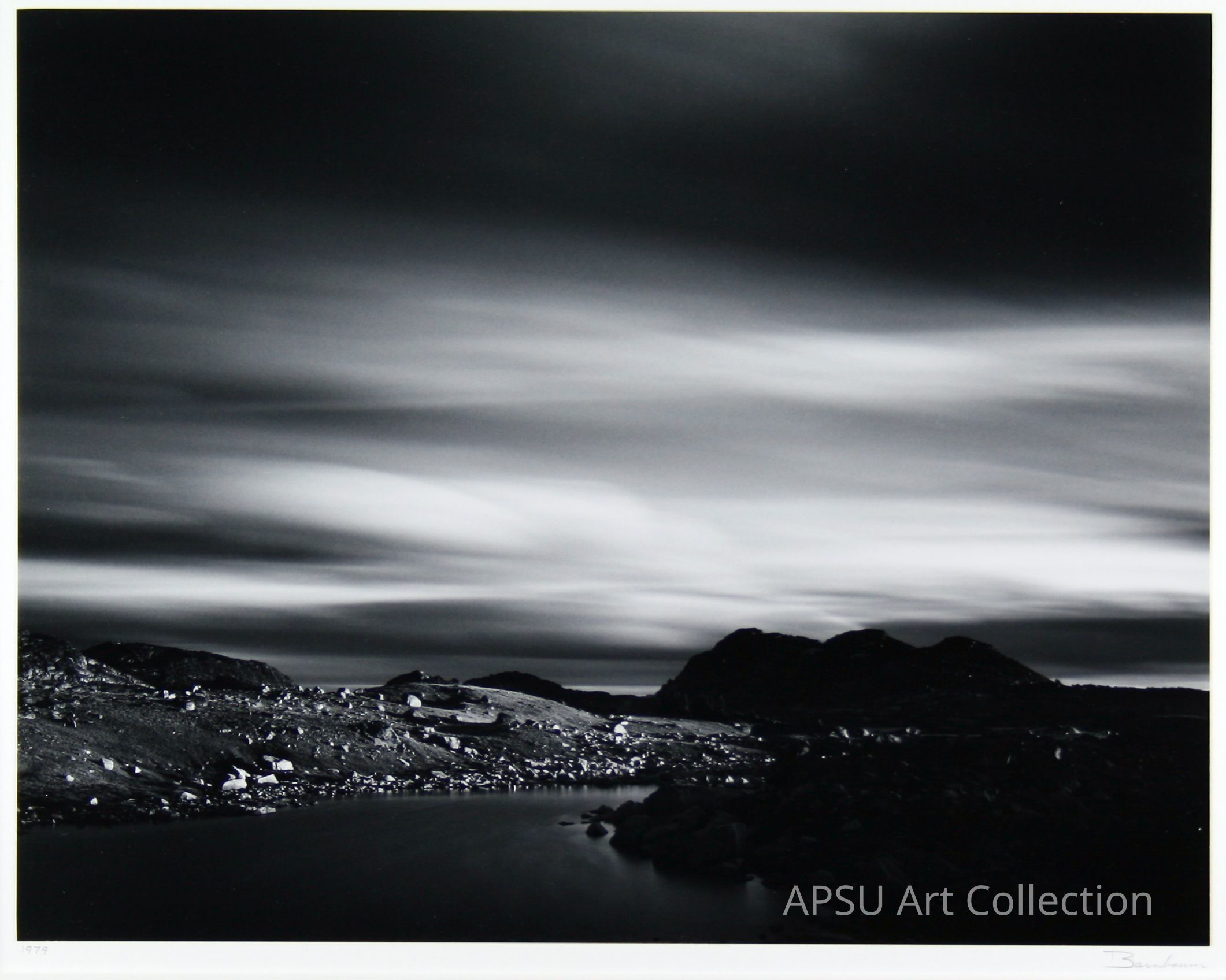 Black and white gelatin silver print of a rocky bank at Fossil Lake with the sunsetting, in Montana 1979Collection
