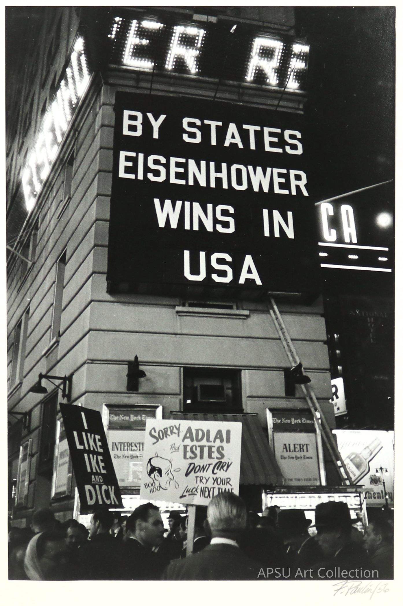 A Gelatin Silver Print photograph of Times Square. The billboard says: "By states Eisenhower wins USA." There is a crowd of people on the bottom, with two people holding signs.Collection