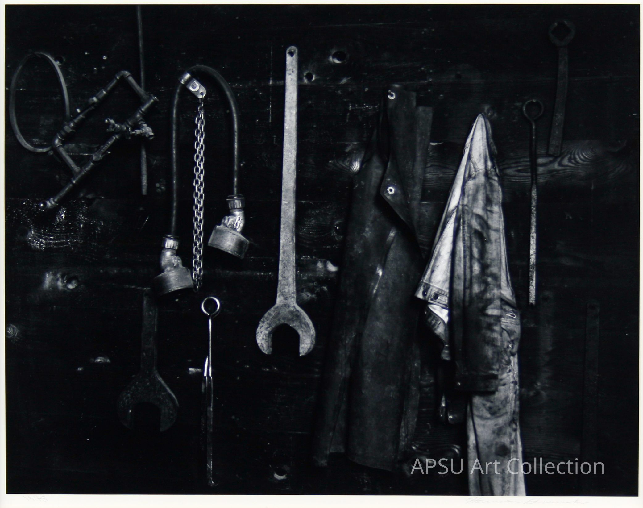 Black and white gelatin silver print of tools and work clothes hanging on old an old wood wall in a dark room, Hoskins, Oregon, 1978.Collection
