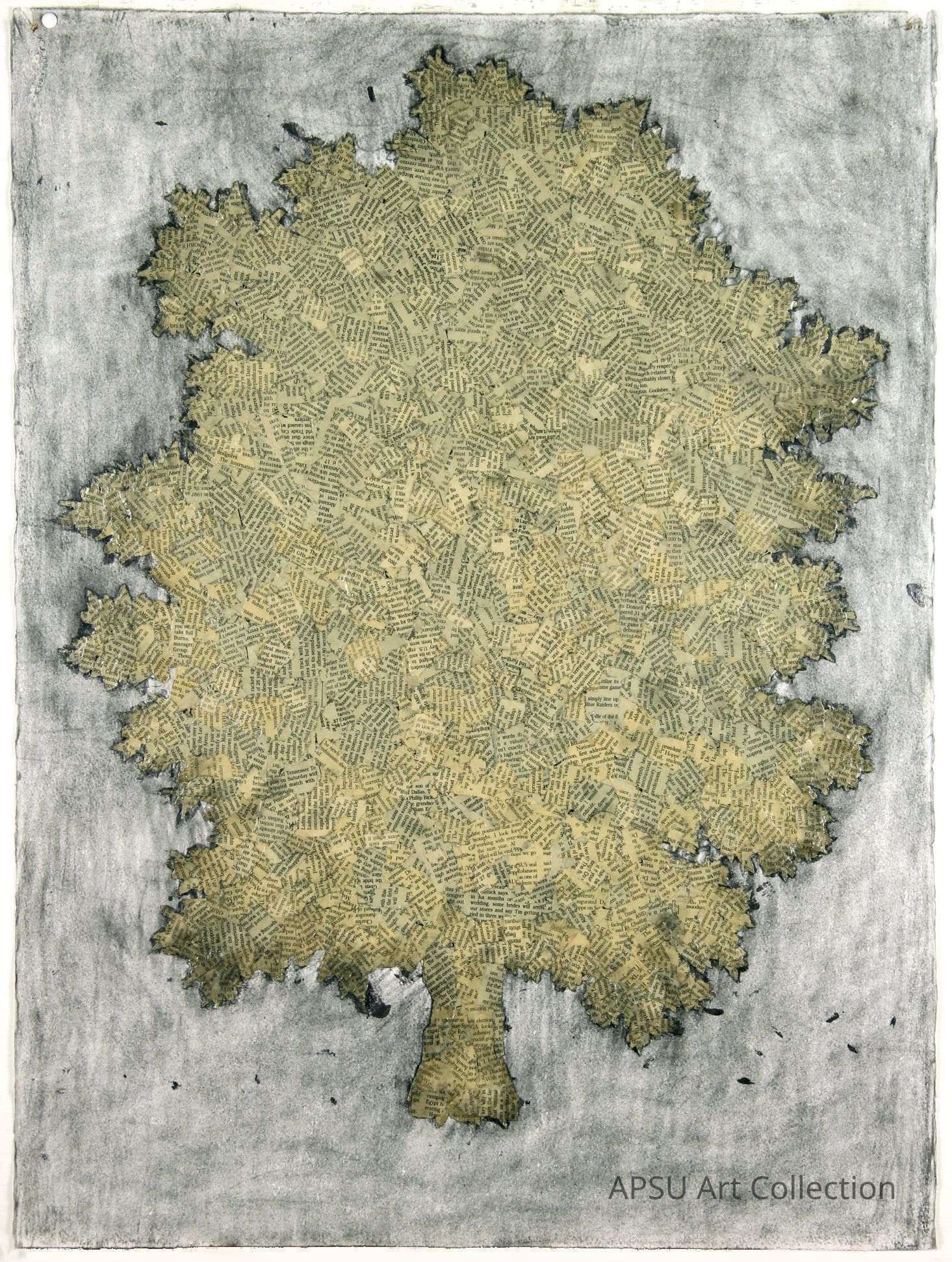 Collage of text (yellowed book pages) to form a tree on a grey graphite/charcoal background on handtorn printmaking paperCollection