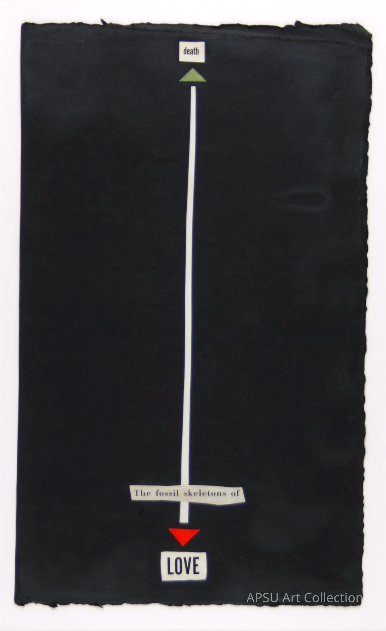 Black deckled edge paper collaged with a vertical timeline structure with the cut out type "death" and an triangle/arrow shape at the top with "love" cut out at the bottom, a red triangle pointing at the word, and on the line the phrase "the fossil skeletons of"