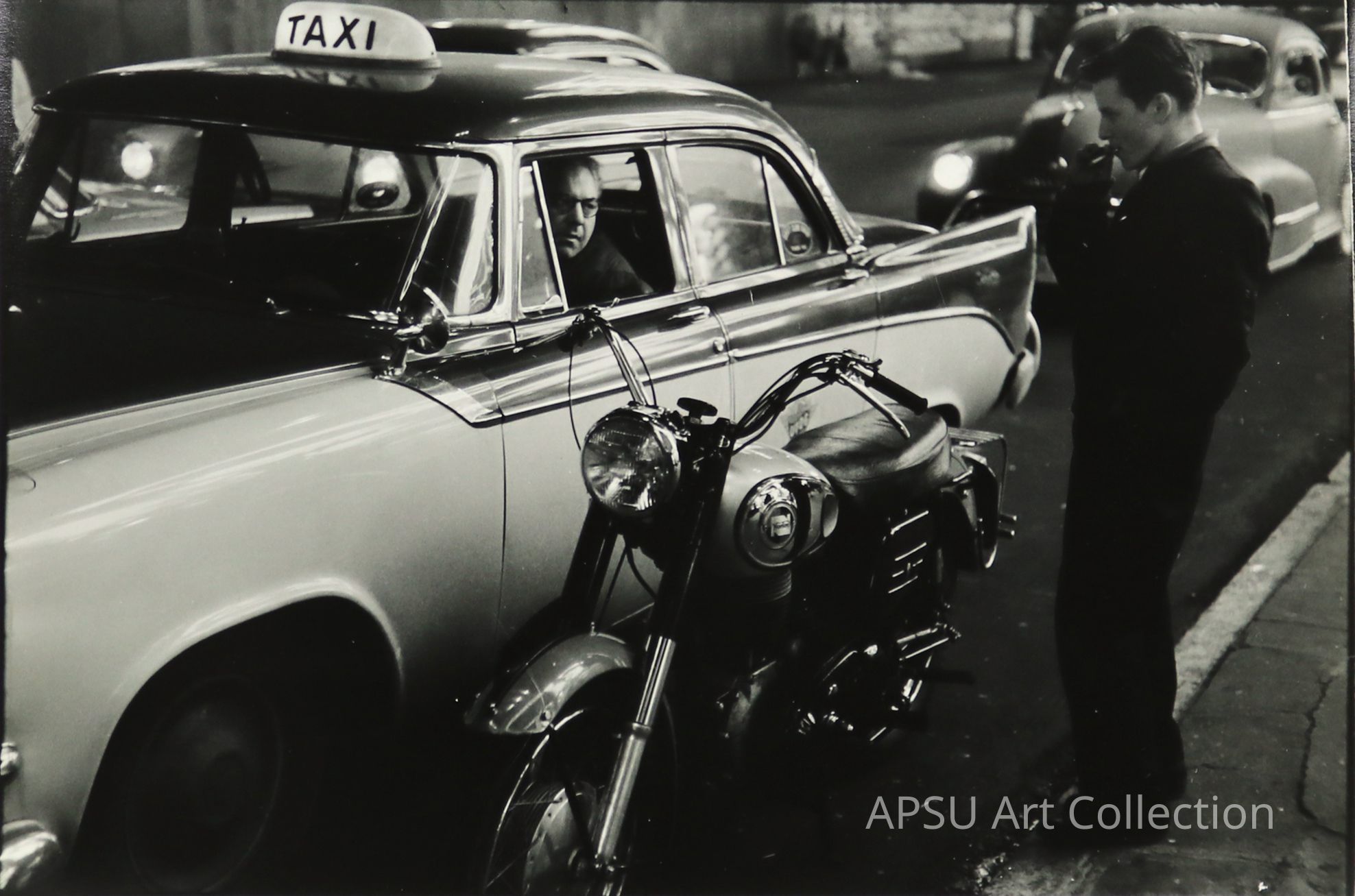 A Gelatin Silver Print photograph of a man with a motorcycle talking to a man in a taxi. The motorcyclist is smoking a cigarette.Collection