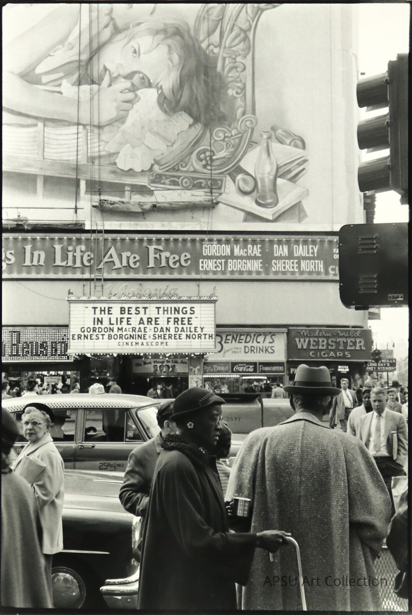 A Gelatin Silver Print photograph of a street in Times Square. There is a large mural of a woman on the top half of the photo, with a busy crowd and traffic on the bottom half. There is also an older white lady glaring on the camera on the left side of the photo.Collection