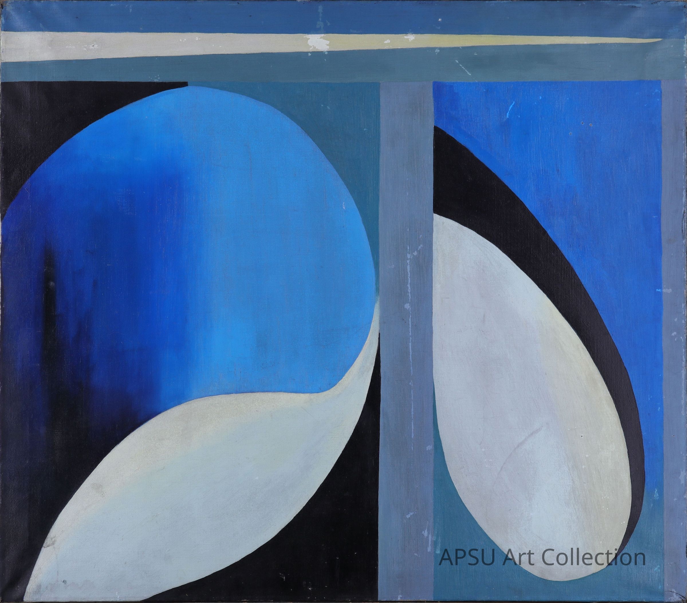The image depicts a modern abstract painting featuring a blend of geometric and organic shapes, primarily utilizing deep blue tones with contrasting white and grey shades. On the left side, there is a large curved form resembling a partial ellipse or crescent, juxtaposed against a rectangular background, creating a sense of depth and movement. The right side of the painting displays another elongated oval shape tilted inwards, divided by a vertical line that subtly echoes the themes of division and symmetry.