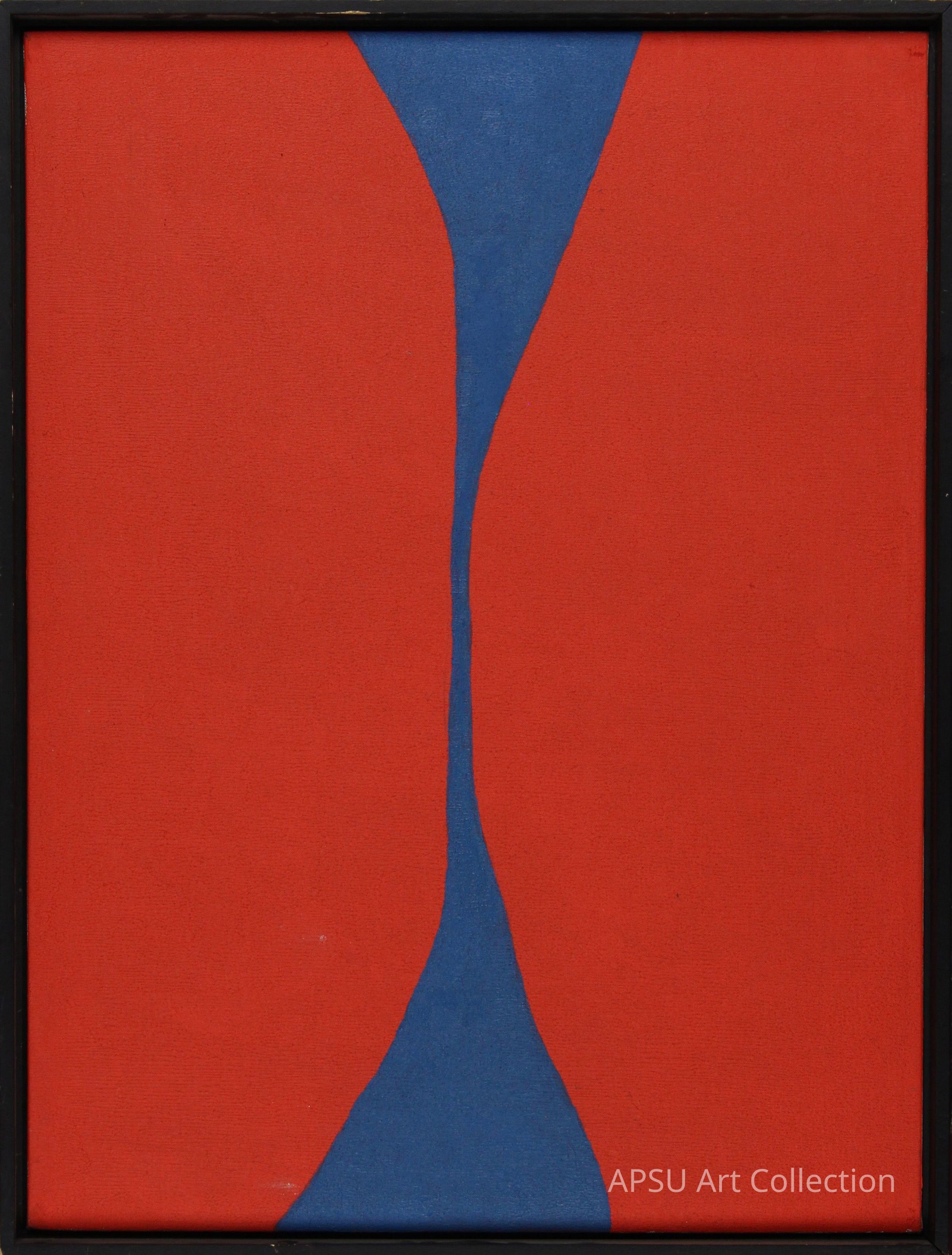 The image depicts an abstract painting featuring a bold and vivid composition, where a striking blue shape reminiscent of an hourglass figure vertically bisects the rectangular canvas, set against a vibrant red background, creating a captivating contrast that draws the viewer's eye towards the center; the use of geometric simplicity and contrasting colors evokes a sense of tension and harmony simultaneously, perhaps suggesting themes of balance and duality, while the black frame subtly encapsulates the artwork, emphasizing the vivid interplay between the two primary colors.