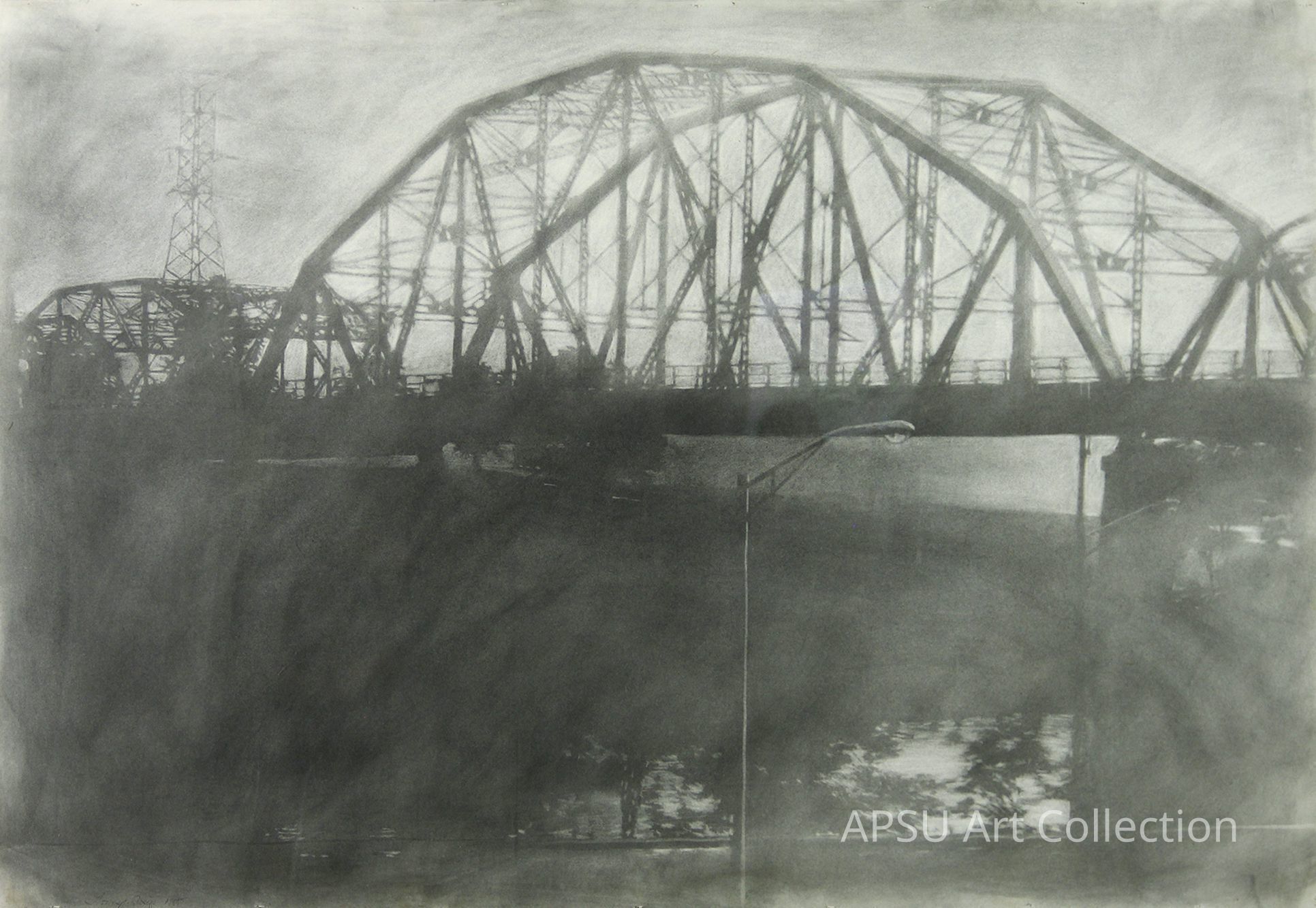 The image showcases a monochromatic, atmospheric drawing of a truss bridge, possibly made with charcoal or graphite, spanning across a river with its intricate metal framework silhouetted against a misty, overcast sky; the foreground reveals a solitary streetlamp and subtle reflections of light on the water’s surface, evoking a sense of industrial solitude and timelessness, while the soft blending of shades creates a hauntingly beautiful ambiance, reminiscent of a quiet, foggy morning.