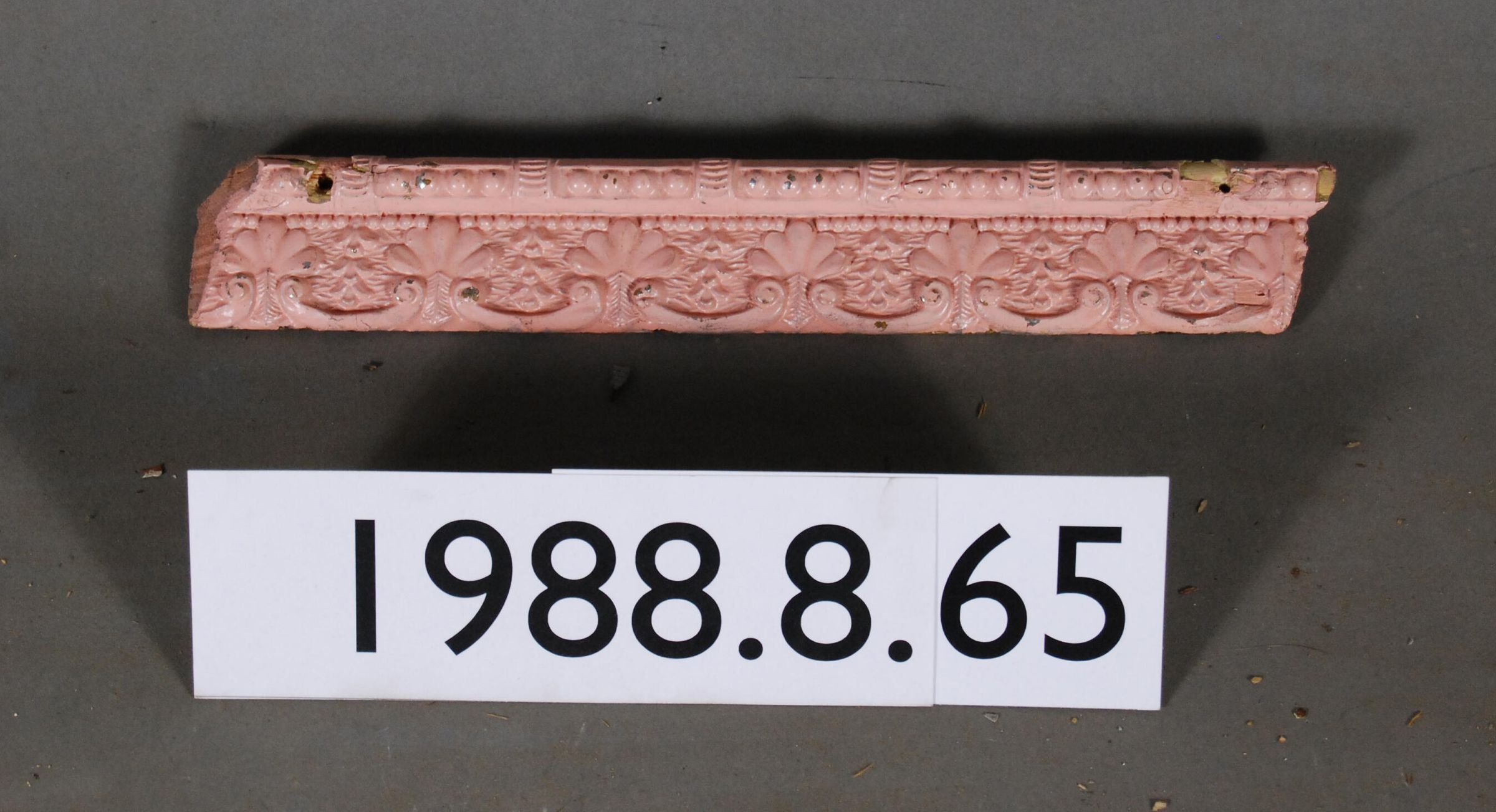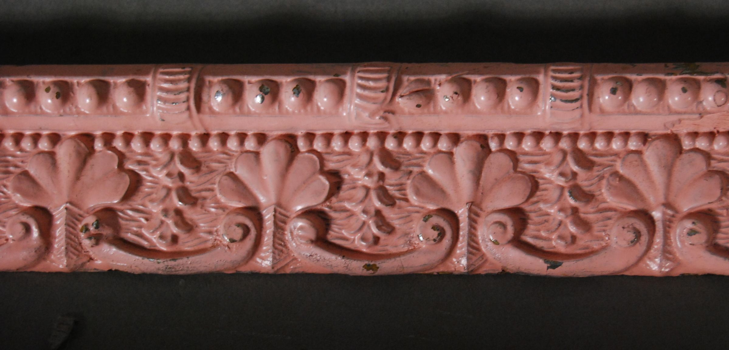 One interior wood picture rail molding, decorated with gesso. Botanical motif with beaded top rail. Original finish silver colored,now painted pink.