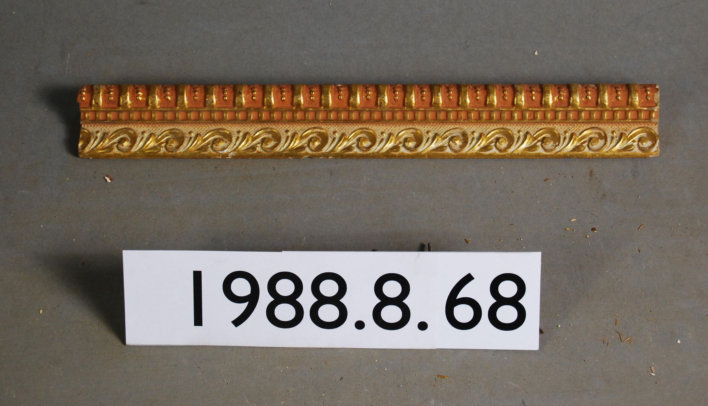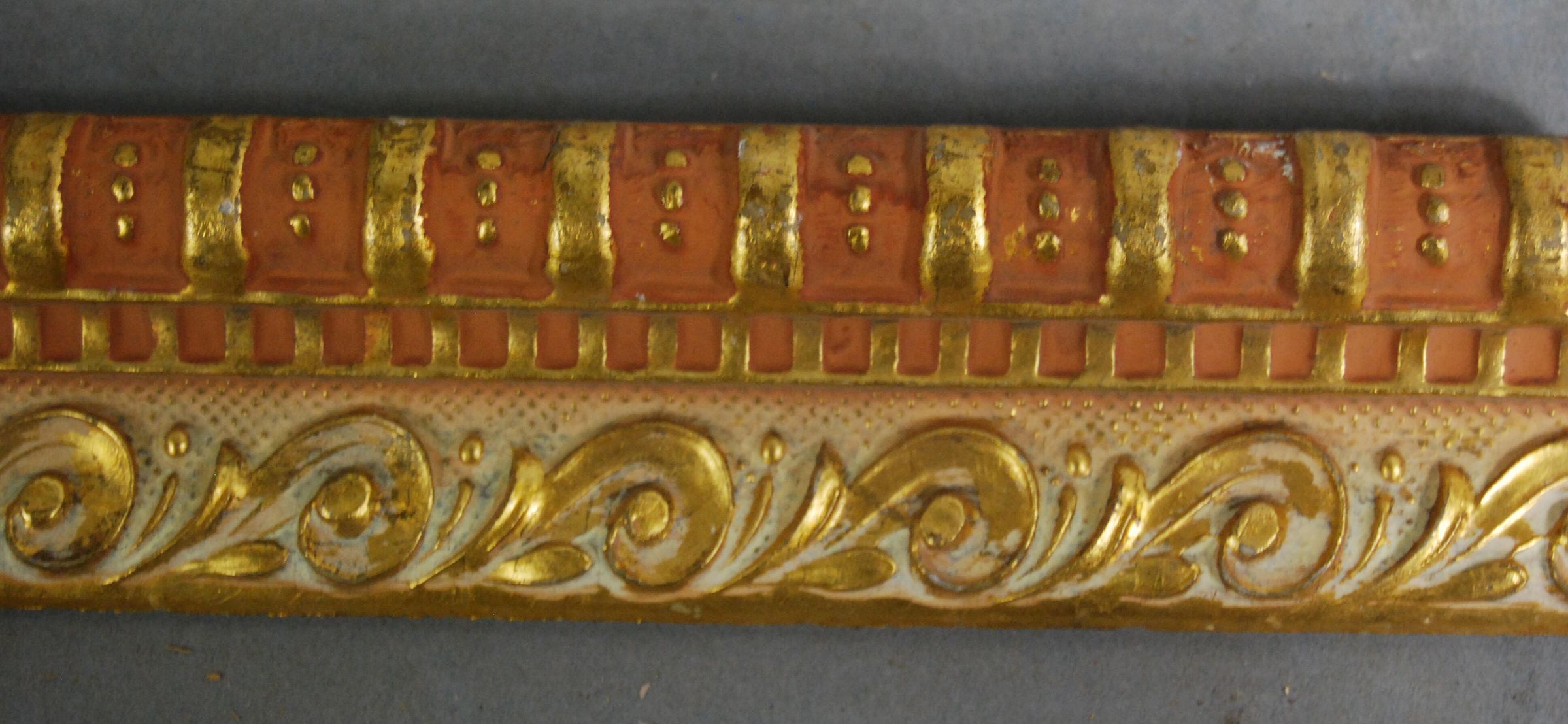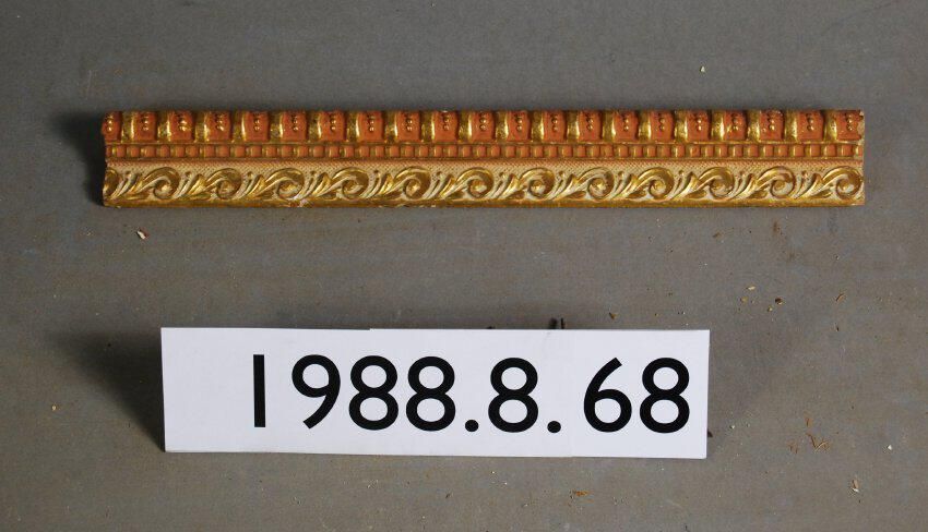 One interior wood picture rail molding, decorated with gesso. Botanical leaf motif with geometric trim and top rail. Original finish gilt,now painted with pink and cream accents.