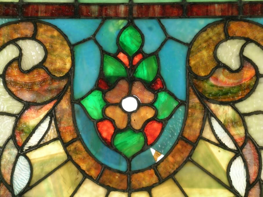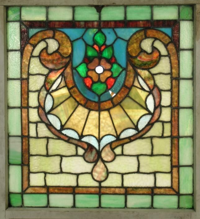 Double-hung window. Dogwood Flower with Fan/Shield Design; Opalescent Rolled Border; Machine Rolled Rippled Glass Border. Jewel in center missing, 1 or 2 cracks.