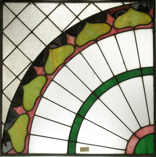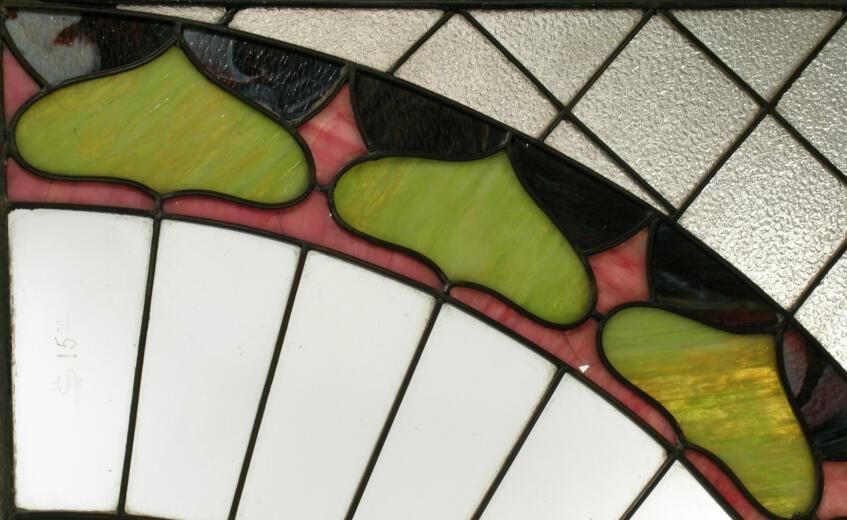 Quarter panel or half panel. Fanlight with Pink and Green Bands; Green Spades; Clear Granite Glass Grid.