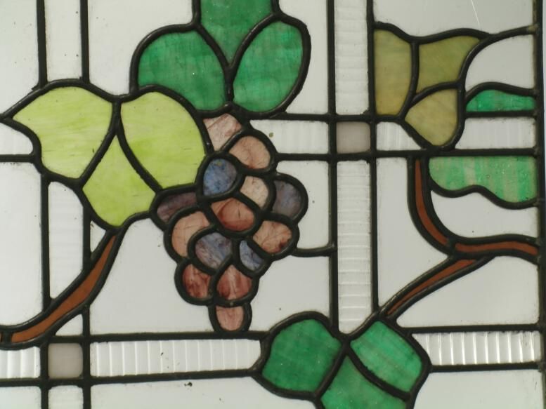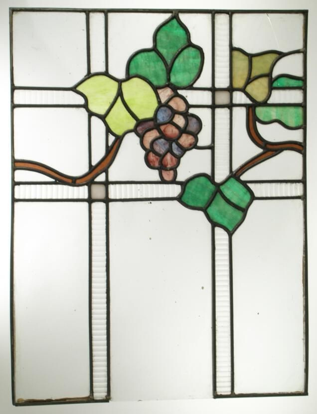 One of a pair of cabinet doors. Grape Vine Motif- Leaves and Grapes; Two Opalescent Squares. By joining with 1988.1.175 a continuous grape vine pattern is produced.