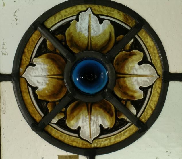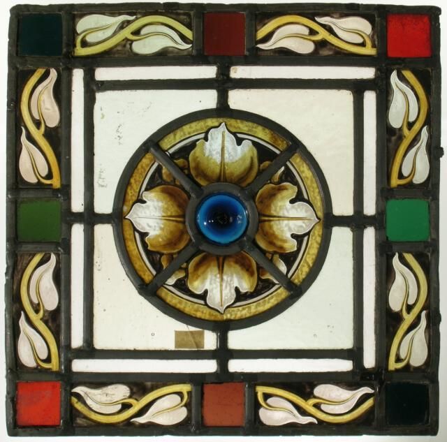 Circular Center with Blue Rondel and Foliage Design; Border with Green and Red Square Rolled Glass; Painted Ivy DesignLexicon