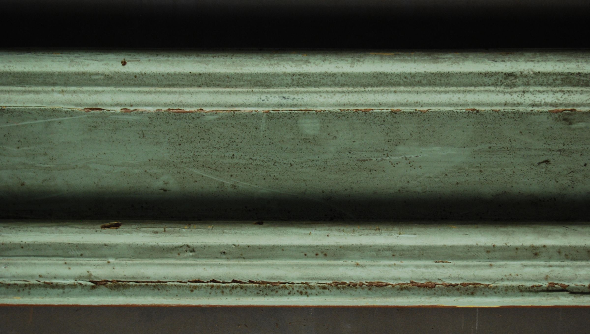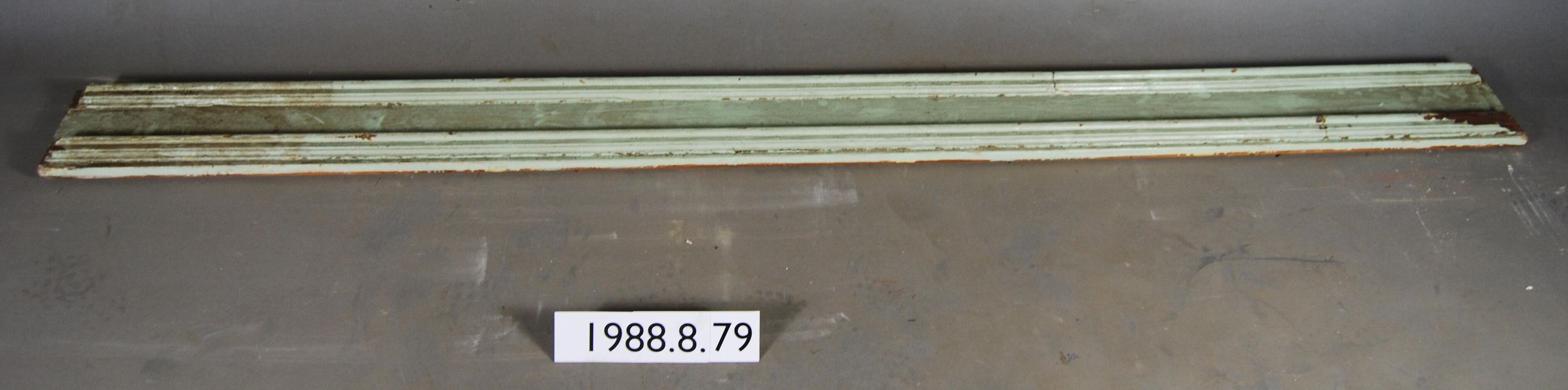 One interior wood molding. Top and bottom picture rails with compound molding profile. Painted green-blue. Inscriptions or Markings: Manufacturer: Place of Manufacturer: Design motif: Style: Finish: Painted Sea-Green-Blue.