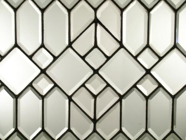 Geometric Design ( Hex Pattern and Diamond Triangle). Wood stops, walnut-stained fir sash.