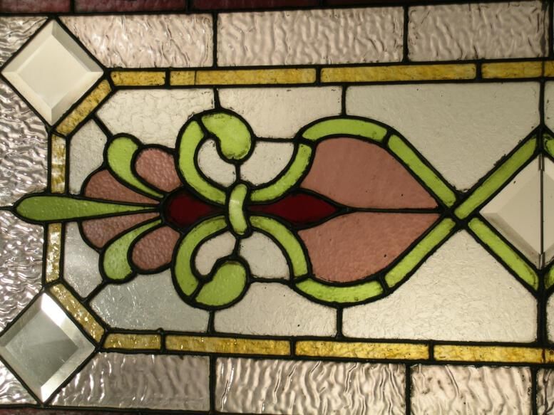 Material: 5 Beveled Diamonds; Flashed Glass; Rippled Glass; Glue Chip Cathedral Glass; Mottled Glass; Rolled Glass Border (Plum and Clear). Pine sash.Lexicon