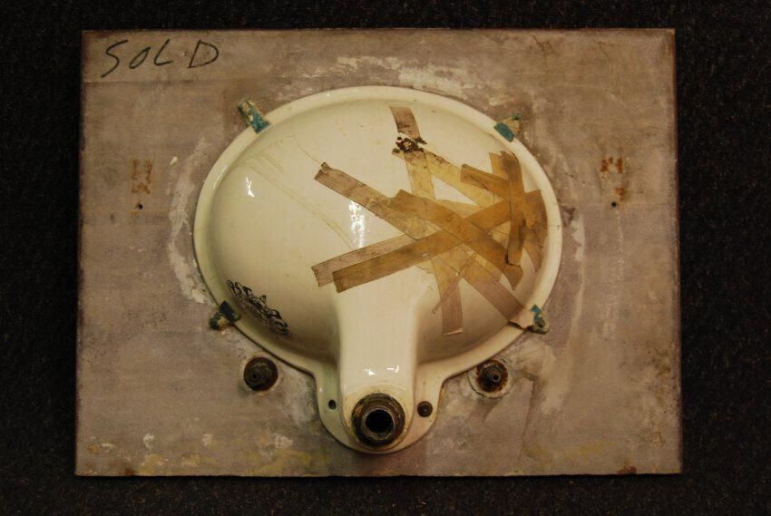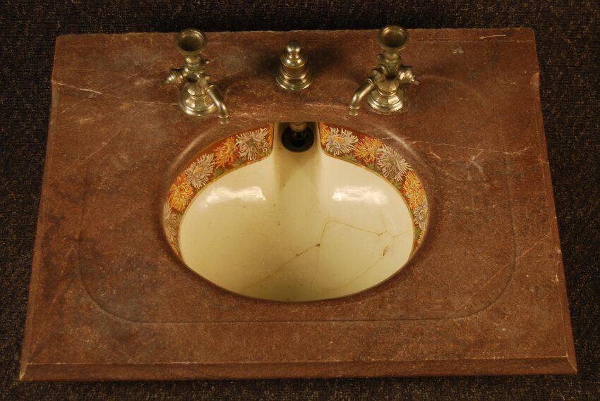 Composed of dark pink marble slap with stop-coved edge and oval opening for oval earthenware sink basin bolted to slab with brass cups. Basin features polychrome band decoration with chrysanthemum motif and gilt edges. Brass drain and pull-up stopper mechanism. Brass hot and cold running water fixtures with ring cups, multi-faceted with spouts. Missing handles. Fixtures have impressed manufacturers mark. Sink basis has manufacturers mark.