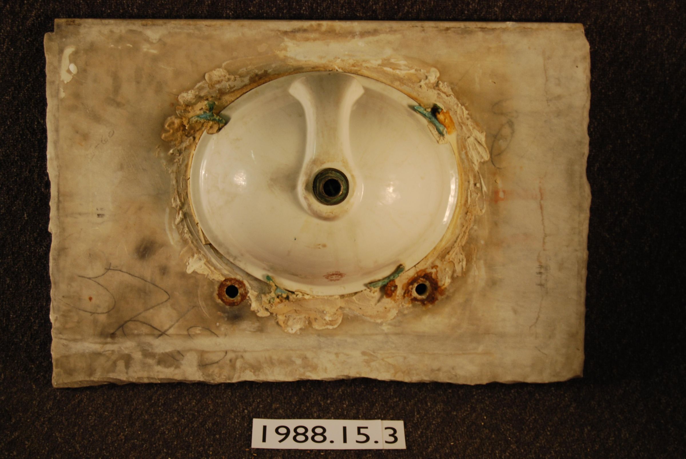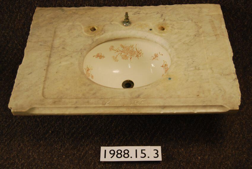 White with gray striations marble slab with stop-cove front edge with oval opening. Oval vitreous china sink basin with brown transfer printed floral motif with polychrome hand painted accents front part of basin. Has overflow drain with strainer holes. Center of basin has opening with brass drain cover. Slabs has mount for drain plug chain. Both hot & cold fixtures missing. Basin features brown transfer printed trademark for 1859 T. M. & S. and impression mark of 78-12-98.