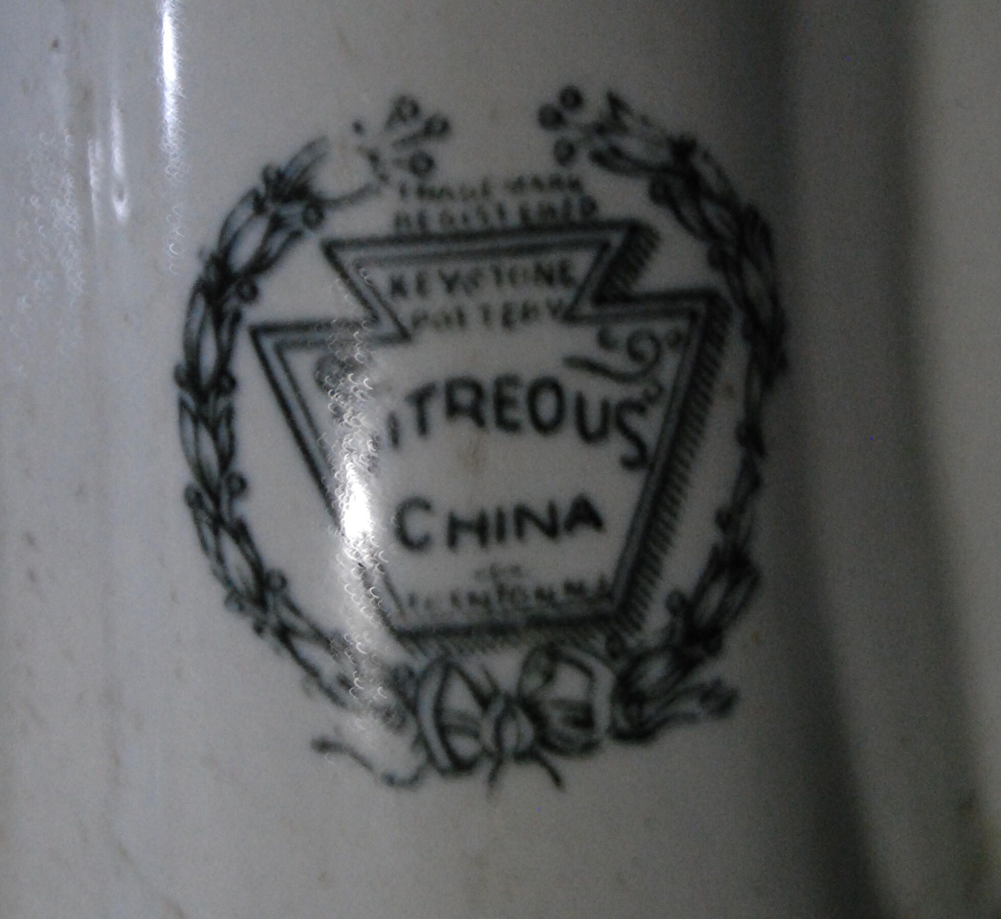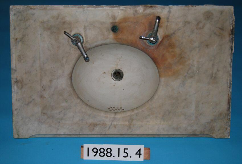 Composed of white with gray striations marble slab with stop-cove front edge, with oval opening for oval vitreous china sink basin, held to with brass clips. Modern (replacements) 1930's to 1940's hot and cold fixtures. Original stopper chain mount. Basin has overflow with strainer holes. Slab features several markings, including "2" and "3- 0 1/4x." Basin features brown transfer printed trademark for keystone pottery, Trenton N. J.