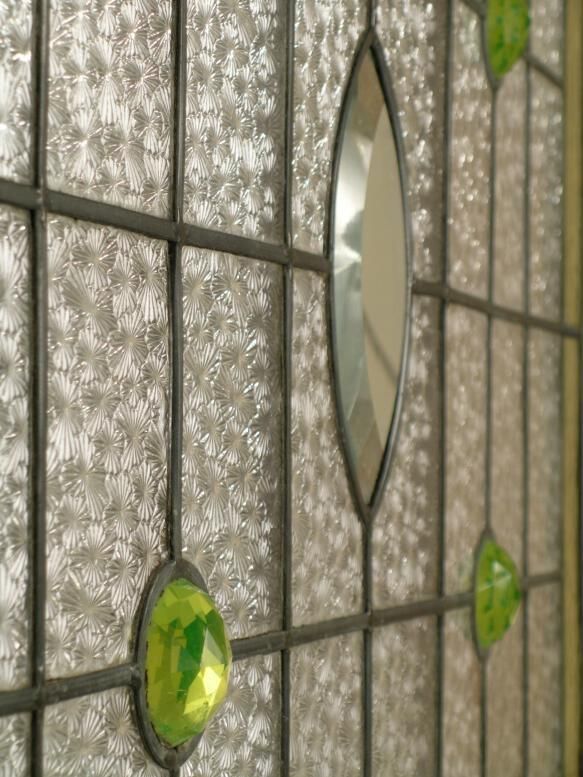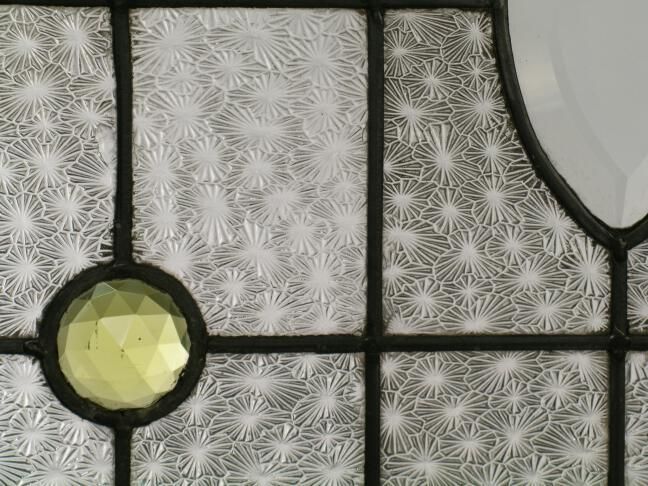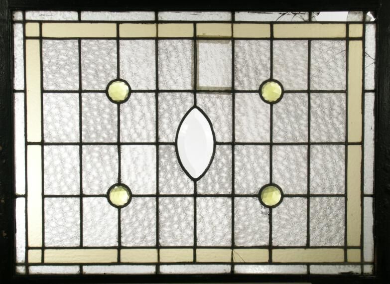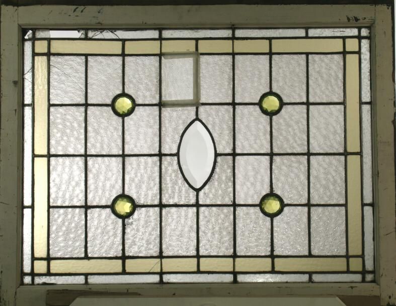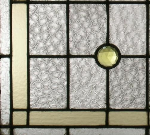 Material: Zinc; Faceted Jewels; Large Oval Center Bevel; Glue Chip Glass; Murisetti Glass; Rolled Glass (Yellow). Cedar sash.Lexicon