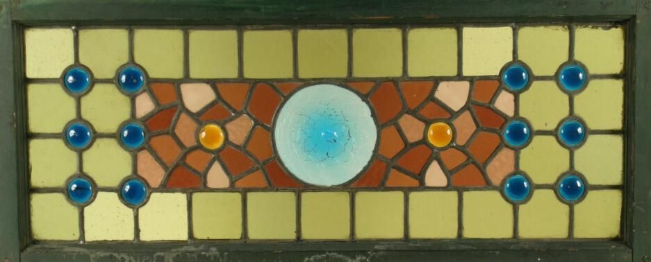 Blue crackle center rondel; 1/2 sphere jewels; mosaic pattern; blue and gold bull's eye jewels; border of rolled greenish glass; lavender glass in mosaic.Lexicon