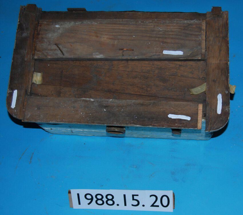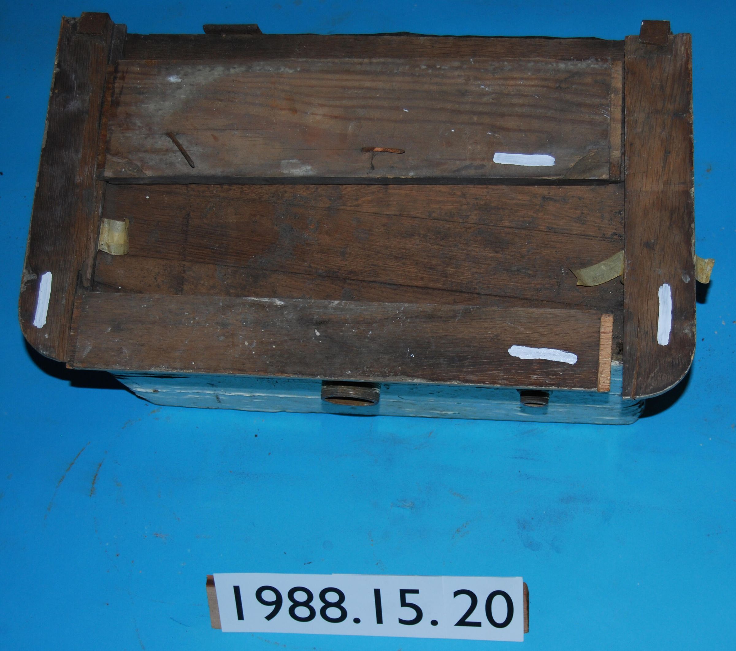 Rectangular. Hardwood. Wall-mounted toilet tank. Copper lined tank. Ball-core for flushing mechanism present and iron arm. Wood boards for mounting disconnected. Painted pale green.