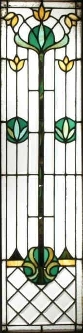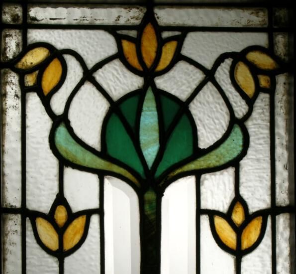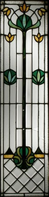 Material: Beveled glass; Muffled - European glass; and with uneven texture (probably not European). Hand rolled glass; Green Flashed glass; Lead. Fir sash. Wood keepers - no molding cuts even on front.Lexicon