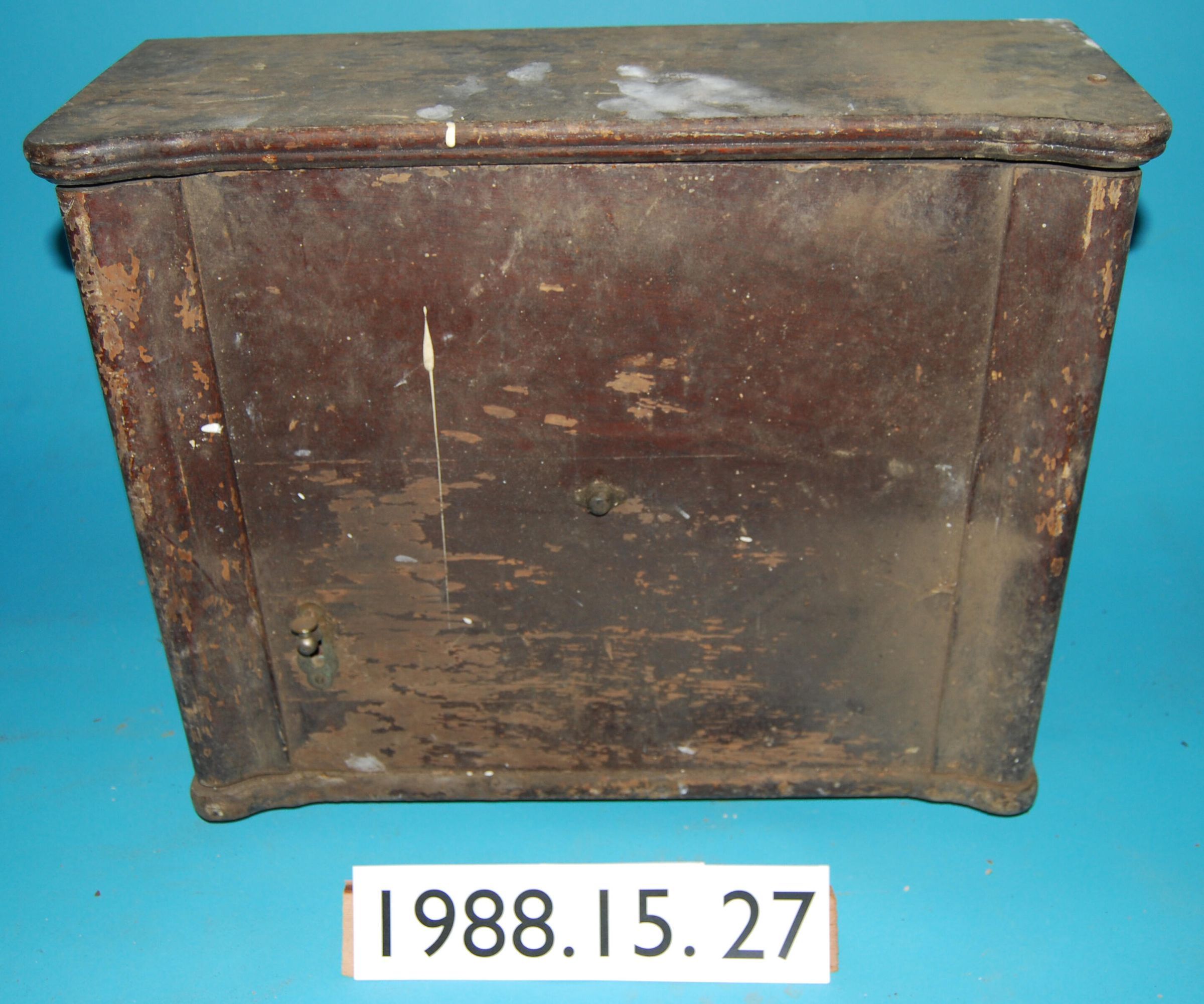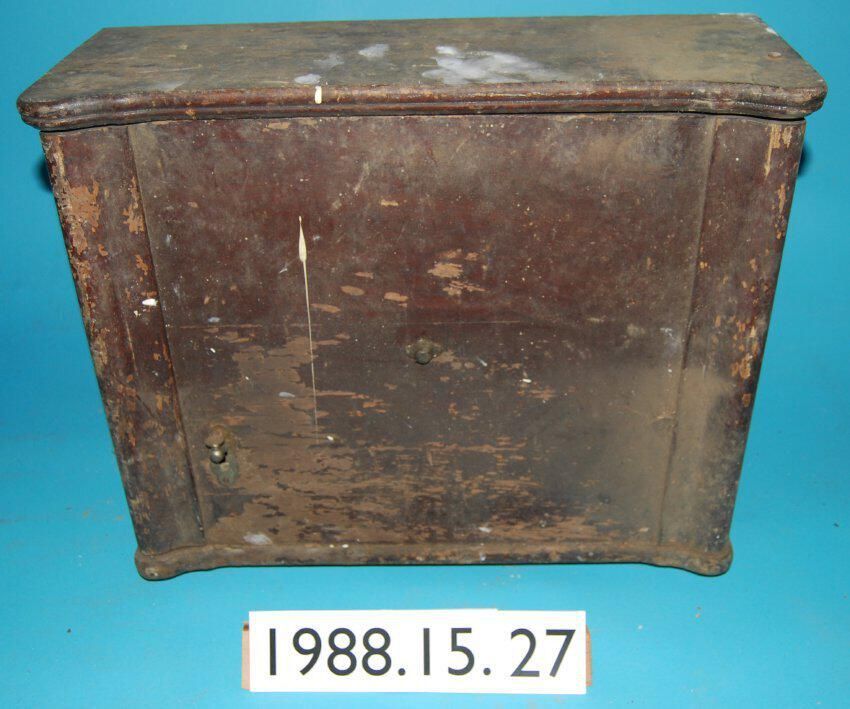 Rectangular. Hardwood. Wall-mounted toilet tank. Copper lined tank. Complete flush valve with brass float and flush lever on face. Moldings on front face with lid.