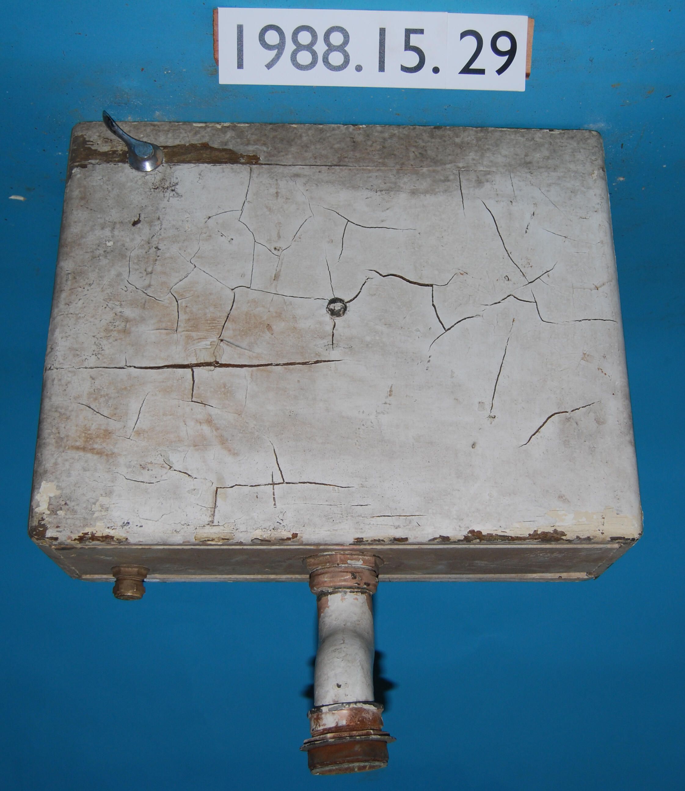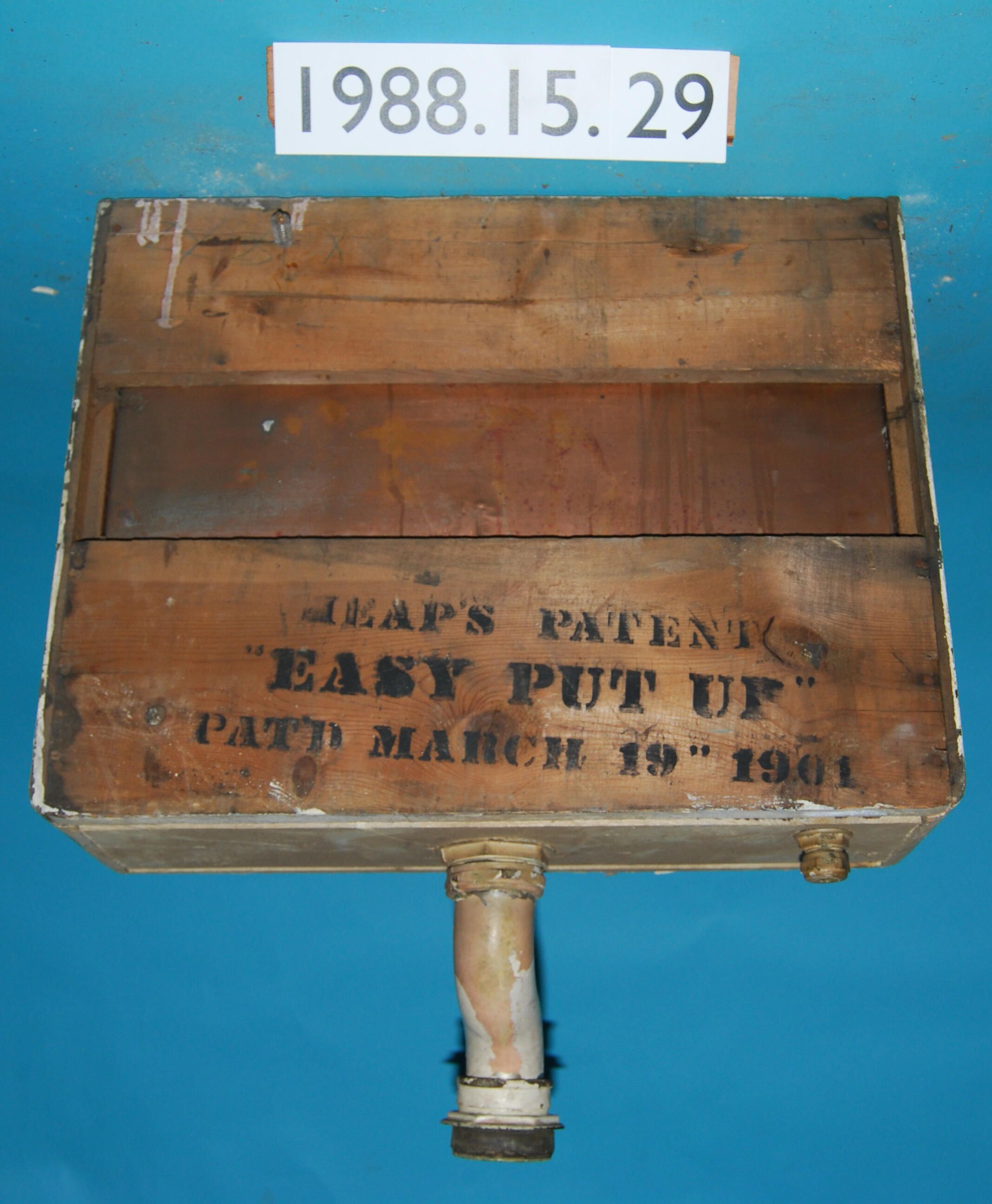 Rectangular. Hardwood. Wall-mounted toilet tank. Complete flushing mechanism with later styrofoam float. Entire mechanism and flush handle replacement circa 1940-1950's. Zink-lined tank. Stenciled patent for "HEAP'S PATENT / EASY PUT ON / PAT'D MARCH 19, 1901. Painted white.